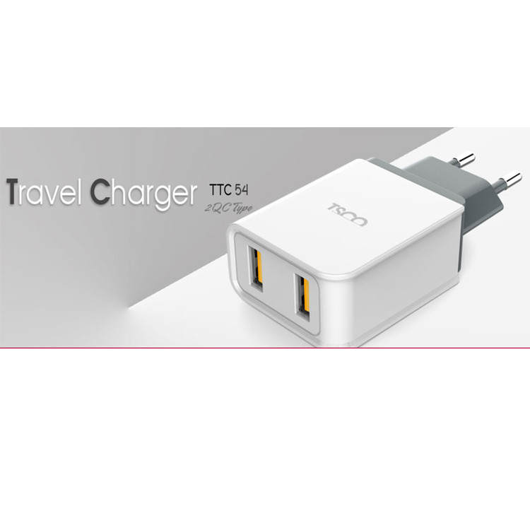 شارژر دیواری TTC 54 یکی از محصولات کوالکوم 3 نسل جدید شارژرهای تسکو است که موبایل و تبلت شما را که از تکنولوژی QUALCOMM 3.0 فست شارژ پشتیبانی میکند تا 75 درصد سریعتر از شارژرهای معمولی شارژ میکند. این شارژر دارای دو درگاه خروجی USB است و میتوان باتری دو دستگاه گوشی موبایل، تبلت، دوربین دیجیتال، موزیک پلیر و... را به صورت همزمان سریع شارژ کرده و در وقتتان صرفهجویی کنید. شدت جریان خروجی در دو درگاه TTC 54 در صورتی که به ولتاژ 5 /12/9 وصل شود به ترتیب 1.5/2/3 آمپر است. ابعاد این شارژر 54x43x25.5 میلیمتر بوده و دوشاخه بهکاررفته در آن هم با پریزهای برق ایران سازگاری دارد.
