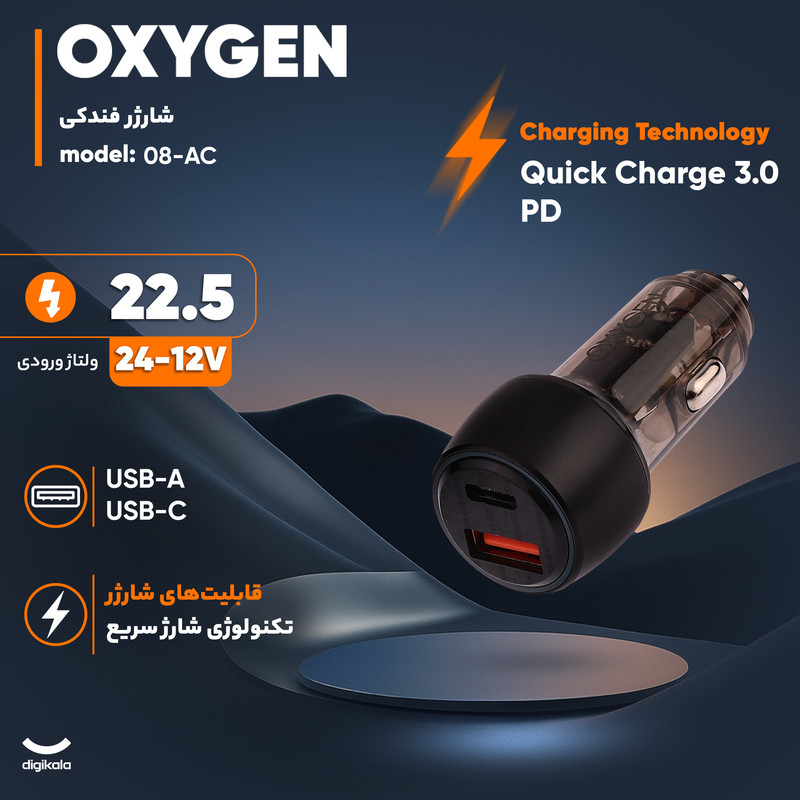 شارژر فندکی 22.5 وات دو پورت اکسیژن مدل AC-08