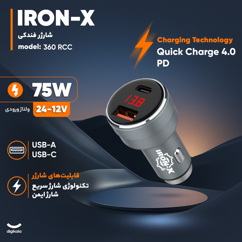 شارژر فندکی ۷۵ وات آیرون ایکس مدل RCC 360 یک انتخاب ایدهآل برای شارژ سریع و ایمن دستگاههای موبایل و تبلت در خودرو است. این محصول با وزن ۷۰ گرم و بدنهای از جنس آلومینیوم مقاوم طراحی شده و به راحتی در فندک خودرو نصب میشود. طراحی سبک و جمعوجور آن، حمل و استفاده در سفرهای شهری و جادهای را بسیار آسان کرده است. مدل RCC 360 دارای دو درگاه خروجی شامل USB Type-C و USB-A است که توان کل آن به ۷۵ وات میرسد و در بازه ۷۱ تا ۸۰ وات قرار دارد. شدت جریان خروجی هر دو درگاه ۳ آمپر است، به این معنی که دستگاهها با حداکثر سرعت ممکن شارژ میشوند. این شارژر از فناوریهای USB PD ۱.۰ و Quick Charge ۳.۰ پشتیبانی میکند که باعث شارژ سریع و ایمن باتریها میشود و خطر آسیب دیدن آنها را کاهش میدهد. از دیگر ویژگیهای برجسته این محصول میتوان به قابلیت Fast Charge اشاره کرد که جریان و ولتاژ مناسب هر دستگاه را شناسایی میکند و شارژ بهینه را تضمین میکند. این قابلیت به ویژه زمانی که چند دستگاه همزمان نیاز به شارژ دارند، بسیار کاربردی است و زمان شارژ را به حداقل میرساند. شارژر فندکی آیرون ایکس RCC 360 با انواع گوشیهای موبایل و تبلت سازگار است و میتواند گزینهای مناسب برای سفرهای طولانی، استفاده روزمره در خودرو و مواقعی که دسترسی به پریز برق محدود است، باشد. در مجموع، RCC 360 ترکیبی از توان بالا، شارژ سریع، ایمنی و طراحی مقاوم و سبک را ارائه میدهد و تجربهای مطمئن و کارآمد برای کاربران فراهم میکند. این محصول برای افرادی که به دنبال شارژ سریع و قابل اعتماد در خودرو هستند، انتخابی بسیار مناسب و کاربردی است.