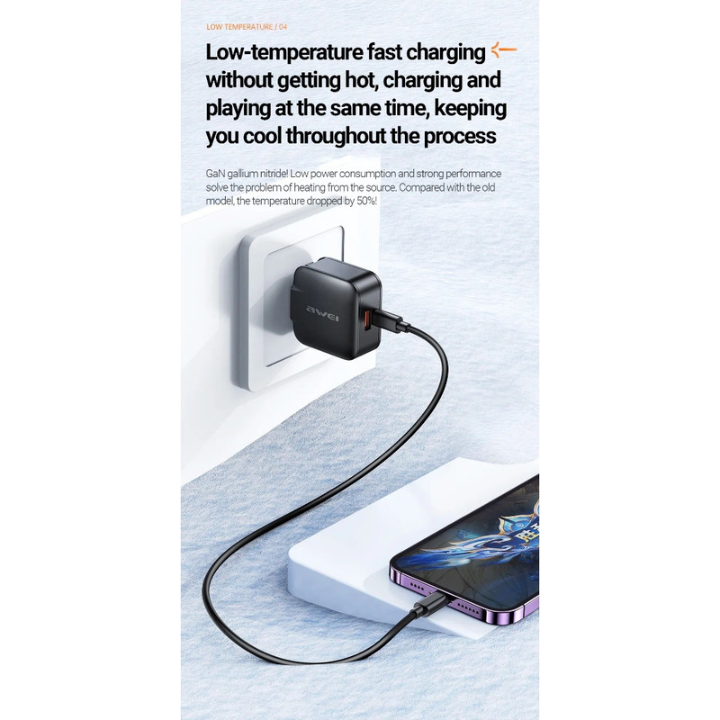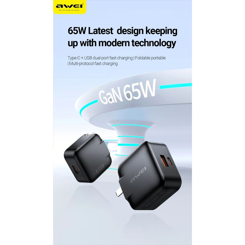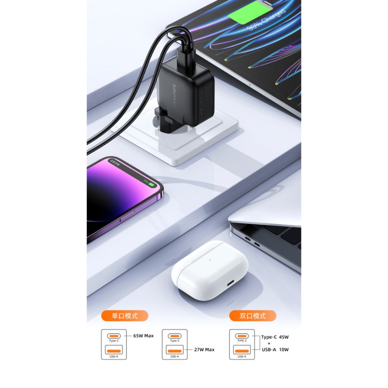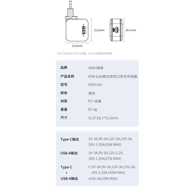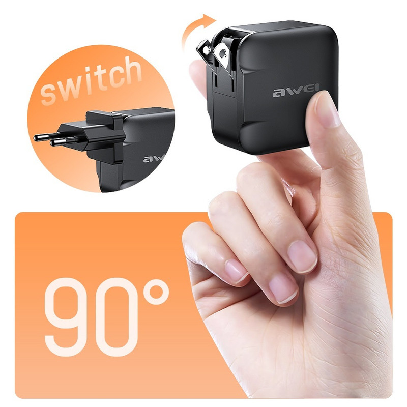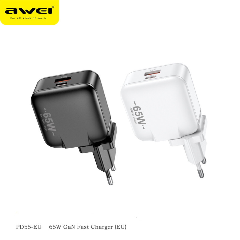 آداپتور شارژ سریع AWEI مدل PD55-EU دارای 2 پورت، یکی Type C و دیگری USB است که از پروتکل PD و QC و… نیز پشتیبانی میکند. همچنین اوی در طراحی این شارژر بر روی ابعاد شارژر جهت استفاده راحتتر هم مانور داده است. این شارژر دارای پین تبدیل دوشاخ امریکایی به دوشاخ معمولی میباشد و از هر دوی این حالت ها بستگی به شرایط میتوانید استفاده کنید . خروجی تایپ C این شارژر دارای توان حداکثر 65 وات و خروجی USB Type A آن دارای توان حداکثر 27 وات میباشد . همچنین اگر همزمان از دو پورت خروجی آن استفاده کنید تواین خروجی تایپ سی 45 وات و خروجی Type A ده وات خواهد بود.