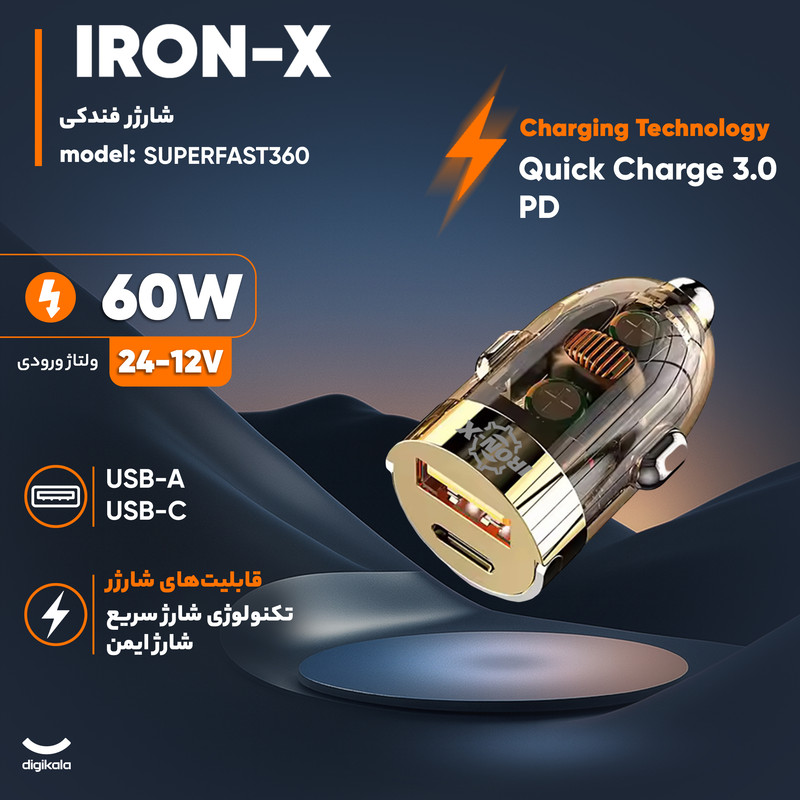 شارژر فندکی 60 وات دو پورت آیرون ایکس مدل SUPERFAST360