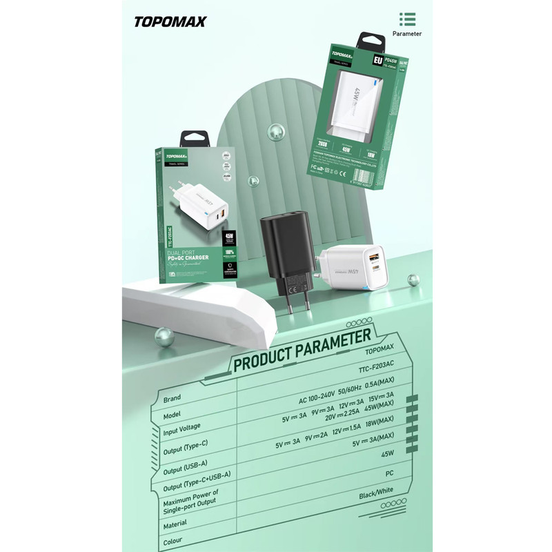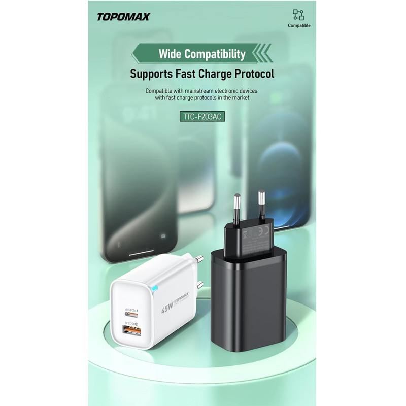 شارژر دیواری 45 وات تاپ مکس مدل TTC-45W 2PORT به همراه کابل تبدیل USB-C