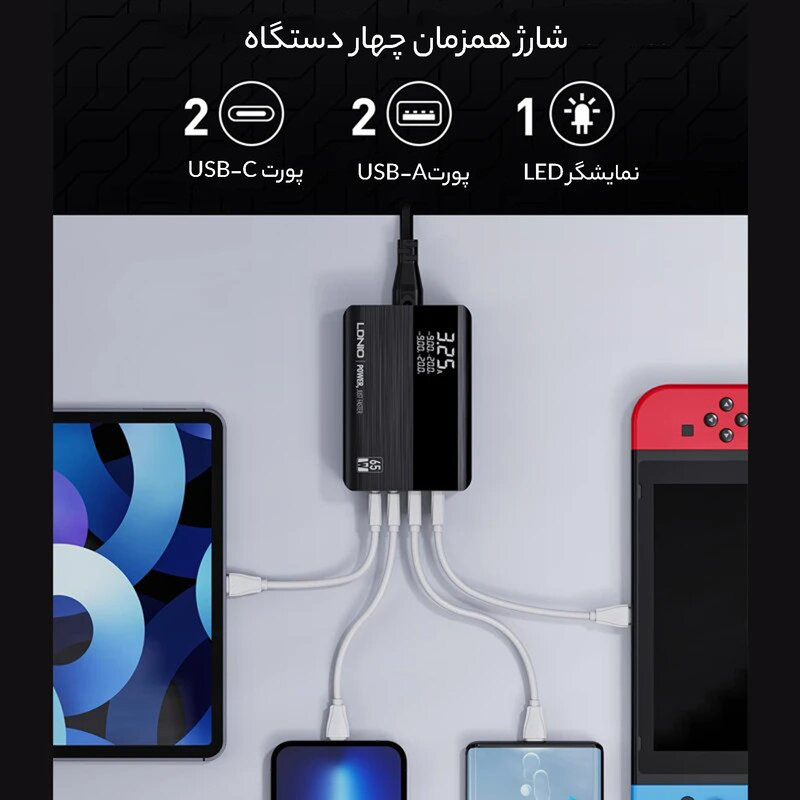 ما در طول روز با کابلهای متفاوتی سر و کار داریم که از نظر تعداد نیز فراواناند. بعضی اوقات برای استفاده از آنها پورت کافی نداریم و دچار مشکل میشویم. اینجاست که داشتن یک شارژر دارای چندین پورت به کمک ما می آید. شارژر رومیزی الدینیو مدل A4808Q PD65W که به تازگی توسط کمپانی الدینیو وارد بازار شده است در این زمینه بسیار کارآمد است. این شارژر با حداکثر توان خروجی 65 وات و داشتن 4 پورت خروجی متشکل از 2 عدد USB و 2 عدد Type C می تواند انتخاب خوبی برای میز کار شما باشد. این شارژر به شکل رومیزی طراحی شده و به عنوان هاب شارژر مورد استفاده قرار می گیرد. این شارژر از مواد pc نسوز ساخته شده و روی بدنه آن یک صفحه نمایش دیجیتالی قرار دارد و میزان ولتاژ و شدت جریان را نمایش می دهد. این محصول همچنین دارای وزن و ابعاد مناسبی است. مشخصات خروجی های این شارژر به شرح زیر است: USB-C1 , USB-C2 output : 5V/3A, 9V/3A, 15V/3A, 20V/3.25A, 65W (max.) USB-A1 |USB-A2 output : 4.5V/5A, 5V/4.5A, 9V/3A, 12V/2.5A, 15V/2A, 20V/1.5A, 30W (max) Total output power : 65W (max.) از مزیت های مهم این شارژر میتوان به توانایی شارژ لپتاپ اشاره کرد. درواقع به واسطه ی پورت تایپ سی ,و توان 65 واتی ، میتوان شارژ لپ تاپ ، تلفن همراه و تبلت را انجام داد.