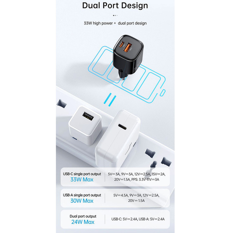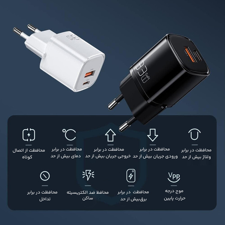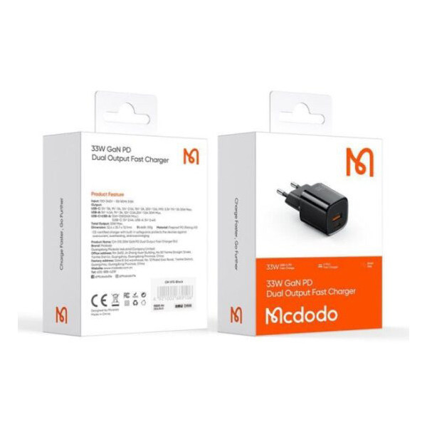 شارژر دیواری 33 وات مک دودو مدل GaN PD دارای 2 پورت یا درگاه بوده که، یک درگاه آن Type C و یک درگاه آن یو اس بی (USB) می باشد.این پورت تایپ سی از تکنولوژی فست شارژ PD اپل و سامسونگ پشتیبانی میکند.این شارژر از جنس Fireproof PC (ضدحریق و نسوز) با تکنولوژی روز ساخته شده است.این محصول از فناوری GaN (GaN در واقع خلاصه شدهی Gallium Nitride یا گالیوم نیترید است که یکی از مواد نیمه رسانای جدید محسوب میشود. از جمله ویژگیهای این ماده میتوان به پهنای باند بالا، رسانایی گرمایی زیاد، مقاومت گرمایی زیاد، مقاوم تابشی، مقاومت در برابر اسید و قدرت و استحکام بالا اشاره کرد) بهره مند است که از به روزترین فناوری های شارژ سریع برای هر دو پورت پشتیبانی میکند.میزان توان خروجی هر پورت در تصاویر امده است.این شارژر دیواری از سری Nano محصولات مک دودو می باشد که بر اساس رنگبندی با کدهای CH-0151,CH-0152,CH-0154,CH-0155,CH-0156 تفکیک می شوند.شارژر Mcdodo محافظت 9 لایه ای ارائه می دهد تا با خیال آسوده از آن استفاده کنید.این آداپتور در برابر توان، دما، ولتاژ،جریان و شارژ بیش از اندازه از گوشی شما محافظت می کند. همچنین جلوی اتصال کوتاه را می گیرد و جرقه نمی زند.