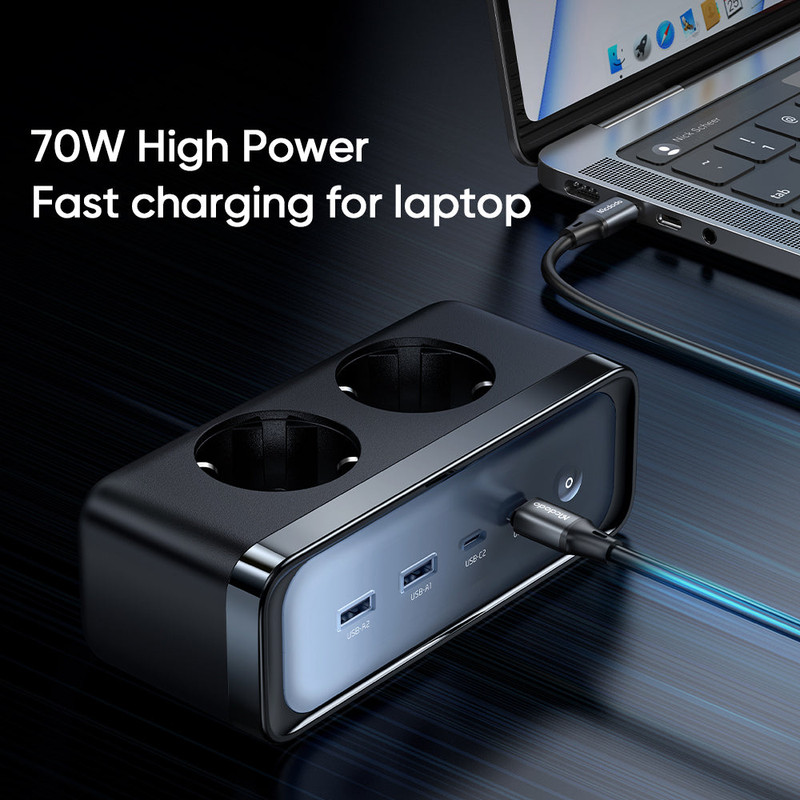 شارژر رومیزی و محافظ برق 70 وات مک دودو مدل CH-4610 جنس بدنه از پلی کربنات ضد حریق مقاوم تاحرارت 750 درجه سانتی گراد ساخته شده است.دارای 2 خروجی پورت USB-A با توان خروجی 30 وات و 2 پورت خروجی شارژ سریع PD تایپ سی 70 واتی و قابلیت شارژ همزمان 4 گوشی موبایل و تبلت و لپ تاپ و نوت بوک و …را دارد.دارای تکنولوژی گالیم نیترید GaN و برخورداری از بازدهی بالا در حجم و ابعاد بسیار کوچکتر میباشد.دو پورت پریز برق قابلیت ساپورت شارژ دستگاه های لوازم خانگی مختلف مانند چای ساز و سشوار و قهوه ساز و … با حداکثر توان 2500 وات و 240 ولت ورودی را داراست.دارای گواهینامه معتبر ایمنی و سلامت CE / FCC / RoHS و دارای کابل اتصال برق 1.5 متری بسیار ضخیم با قطر هسته مسی داخلی بسیار ضخیم میباشد.