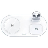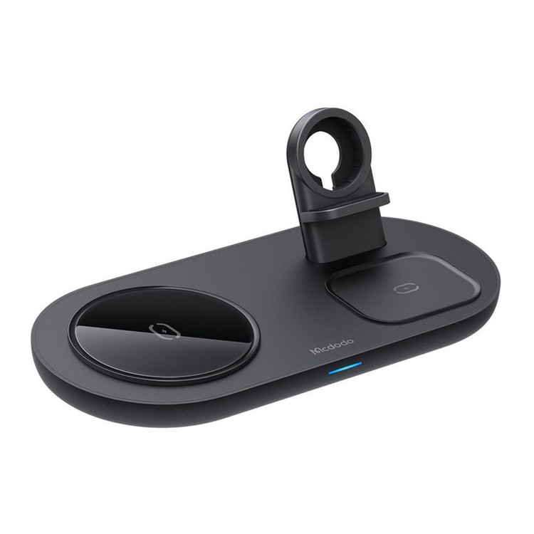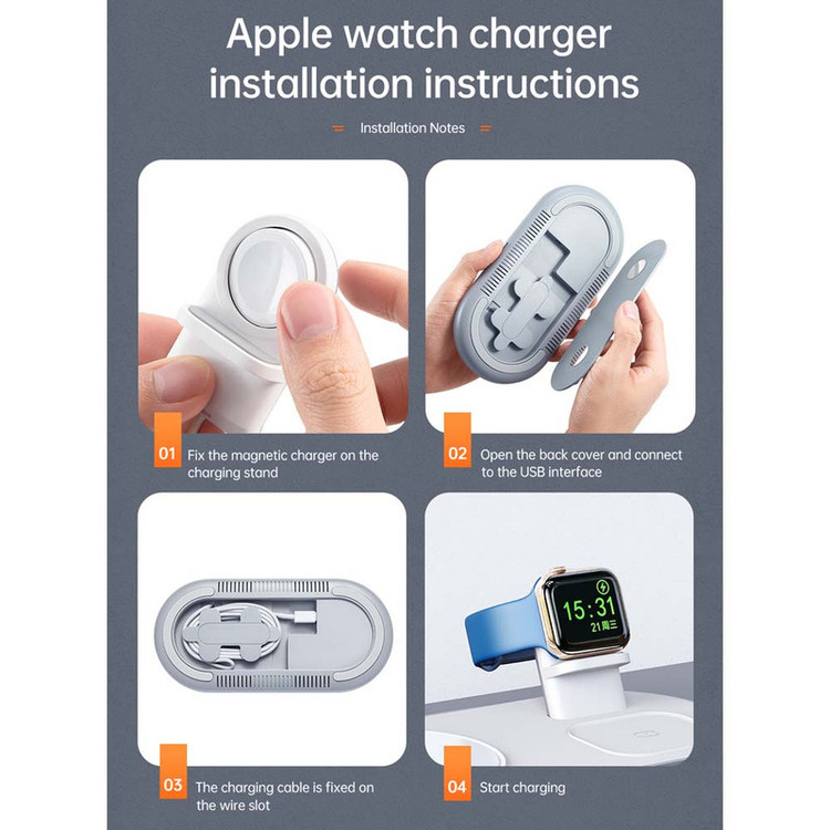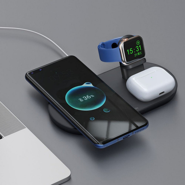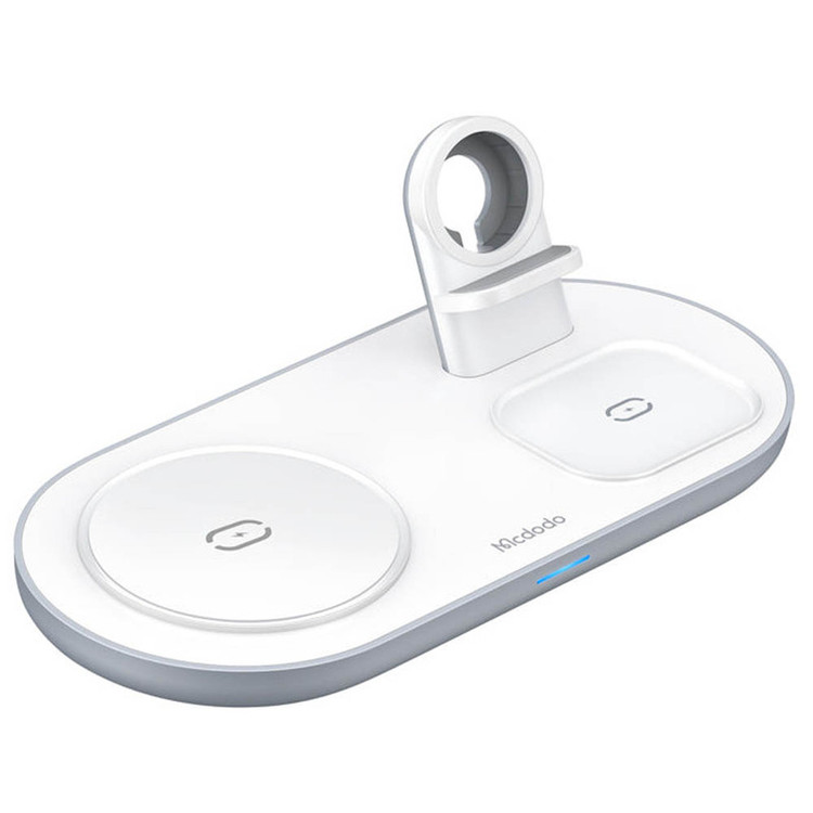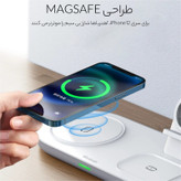 پایه شارژ 3 کاره مناسب برای اپل واچ ، ایرپاد اپل (یا هدفونهای مجهز به فناوری شارژ بیسیم) و تمامی تلفنهای مجهز به تکنولوژی شارژ بیسیم. در این محصول محلی برای قرار دادن گوشی تلفن،هدفونهای بیسیم با تکنولوژی شارژ بیسیم مانند ایرپاد و همچنین محلی مخصوص اپل واچ وجود دارد. محل قرار دادن اپل واچ طوری طراحی شده است که شما با قرار دادن شارژر مگنتی با کابل تایپ سی ساعت خود میتوانید ساعت را در آن قرارداده و شارژ نمائید. این شارژر مجهز به درگاه TYPE-C میباشد که کابل مربوطه با بهترین کیفیت نیز درون جعبه دستگاه وجود دارد. حداکثر توان خروجی دستگاه 15 وات میباشد و البته از مقادیر پایینتر 5 یا 10 وات هم پشتیبانی میکند. در محل قرارگیری گوشی مگنت قرارداده شده که با وجود این ویژگی از شارژ سریعتر آیفونهای سری 12 میتوانید اطمینان حاصل نمائید. استند دارای دو کویل مغناطیسی قدرتمند است. این دو کویل علاوه بر قدرت بالایی که دارند کاملا مستقل از هم نیز عمل میکنند. بنابراین در فرایند شارژ همزمان هیچ اختلالی ایجاد نمیشود.برای کارایی بهتر است از شارژر تایپ سی با توان 20 وات و بالاتر بهره بگیرید.(نحوه جاگذاری شارژر اپل واچ با کابل تایپ سی در تصاویر آمده است).