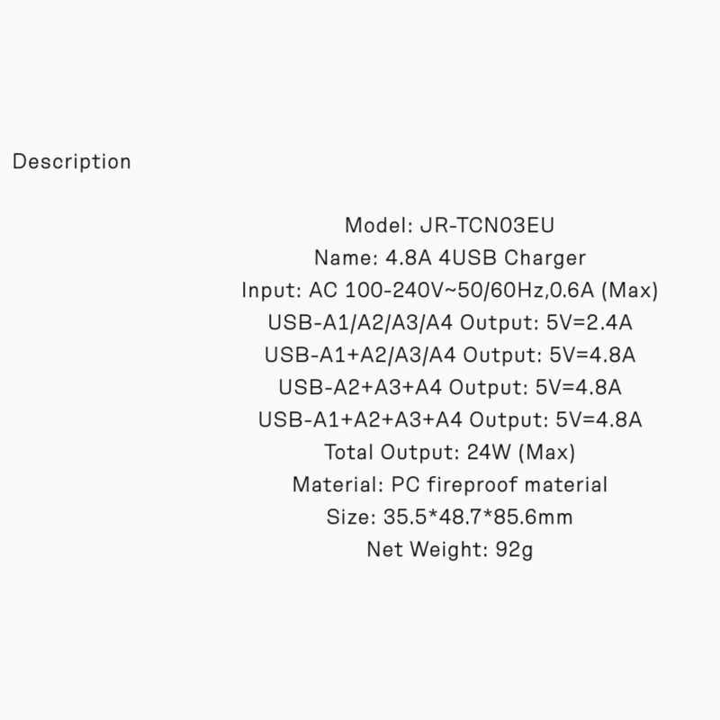 شارژر دیواری Joyroom JR-TCN03EU : آداپتور شارژ جوی روم JR-TCN03EU دارای 4 پورت USB است. ولتاژ ورودی آن برابر با 100-240V است. روی بدنه این شارژر چهار پورت USB همسان قرار داده شده است که شدت جریان هر کدام 5V-2.4A که در مجموع دارای توان 24W می باشد. ابعاد شارژر 35.5x48.7x85.6 میلیمتر و وزن آن 92 گرم می باشد.