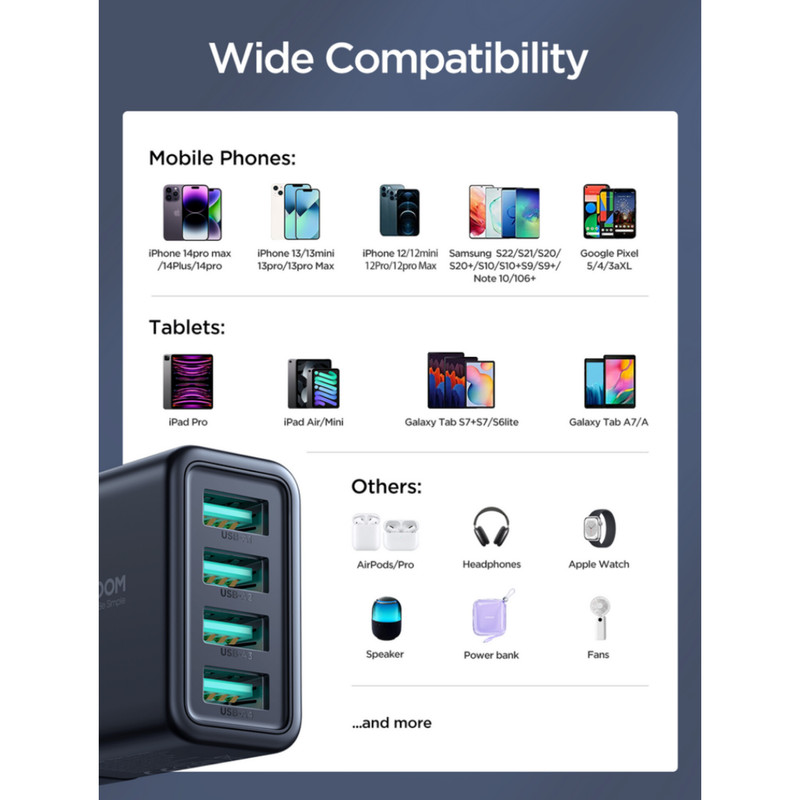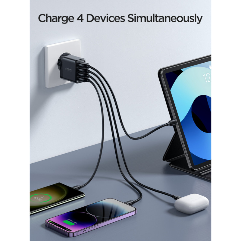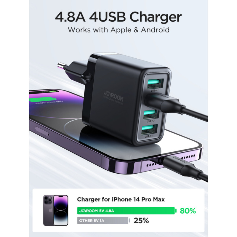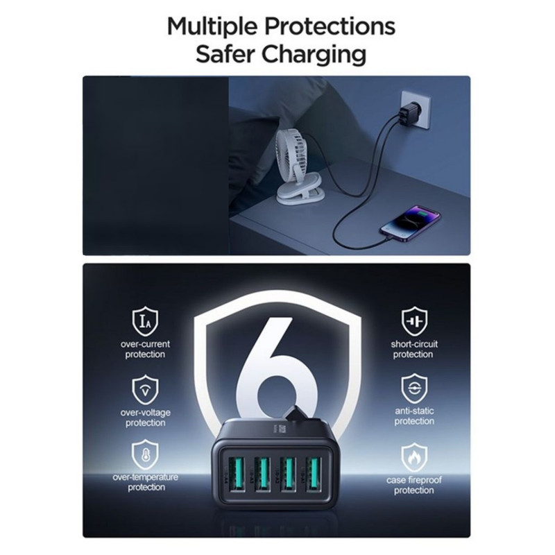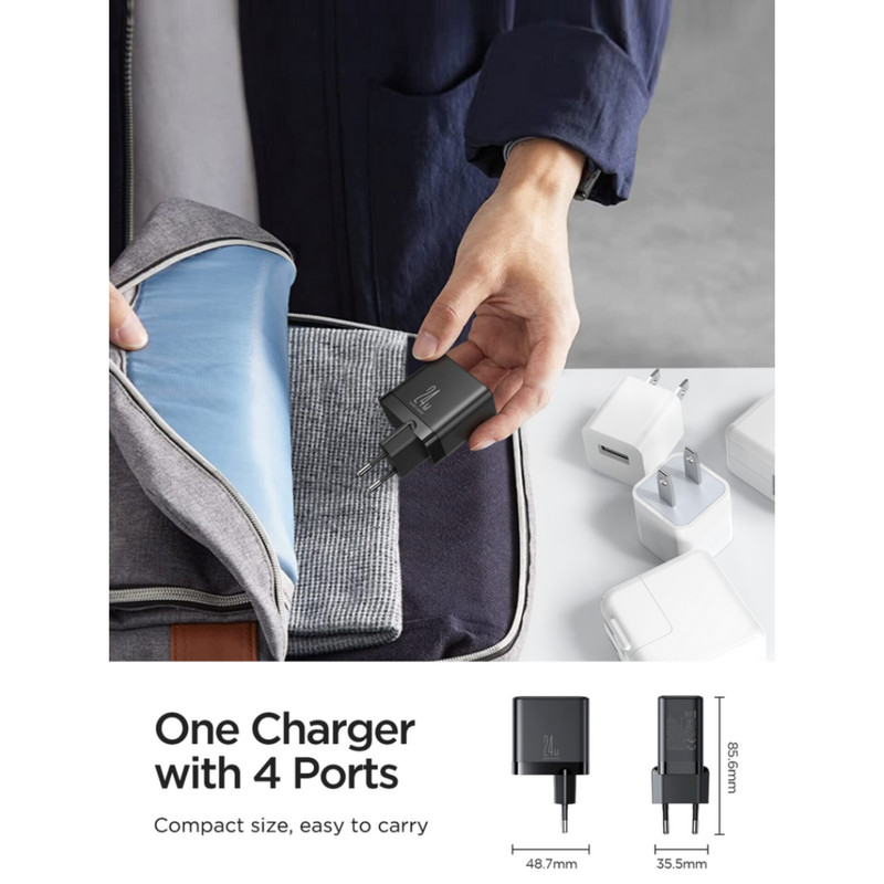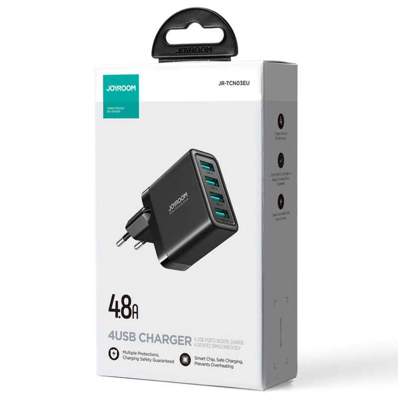 شارژر دیواری Joyroom JR-TCN03EU : آداپتور شارژ جوی روم JR-TCN03EU دارای 4 پورت USB است. ولتاژ ورودی آن برابر با 100-240V است. روی بدنه این شارژر چهار پورت USB همسان قرار داده شده است که شدت جریان هر کدام 5V-2.4A که در مجموع دارای توان 24W می باشد. ابعاد شارژر 35.5x48.7x85.6 میلیمتر و وزن آن 92 گرم می باشد.