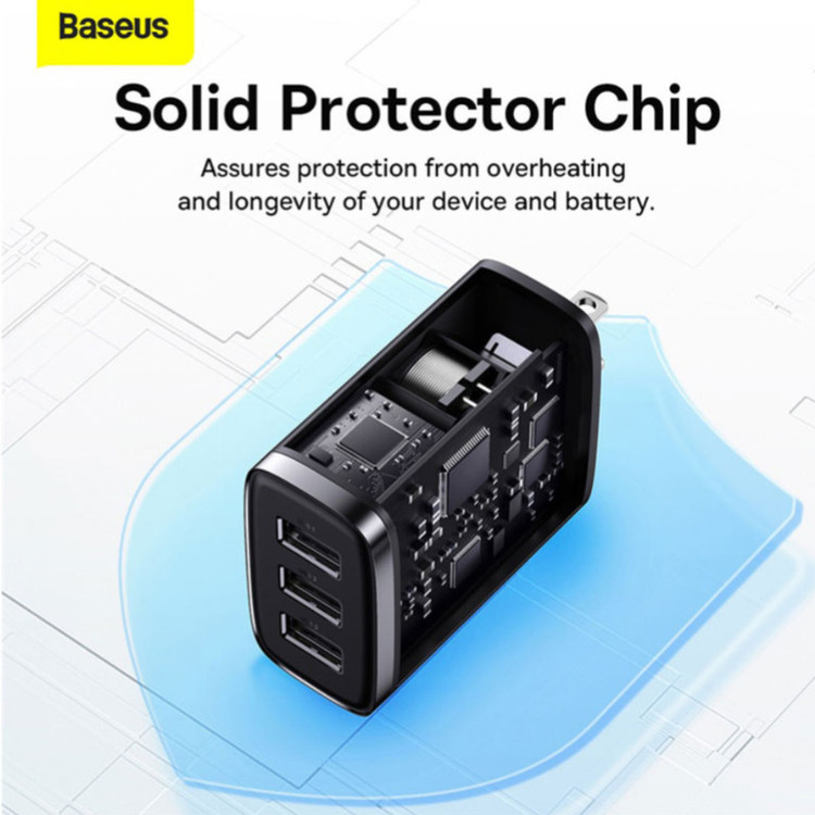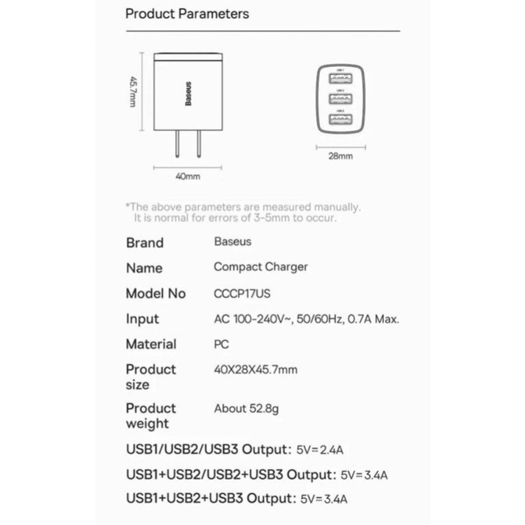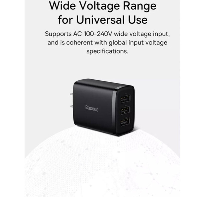 آداپتور بیسوس Baseus CCXJ020001 Compact Charger 3U EU توان 17 وات : کمپانی بیسوس این محصول را در دو رنگ با کدهای متفاوت تولید کرده است. بدین ترتیب که کد CCXJ020002 مربوط به رنگ سفید و کد CCXJ020001 مربوط به رنگ مشکی است. برای اینکه بتوانیم وسایل خود را به بهترین شکل ممکن شارژ کنیم و همیشه آن ها را آماده برای استفاده نگه داریم، روش های مختلفی وجود دارد؛ اما از مطمئن ترین این راه ها استفاده از شارژرهای دیواری است. پورت بیشتر، توان بالاتر و شارژ سریع از ویژگی های مهم یک شارژر دیواری می باشد که باید به آن توجه داشته باشید. شارژر دیواری بیسوس Baseus CCXJ020001 دارای 3 درگاه USB بوده و دارای توان حداکثری 17 واتی می باشد. شما می توانید سه دستگاه را همزمان به این آداپتور متصل و شارژ کنید. طراحی : شارژر دیواری بیسوس CCXJ020001 از پلاستیک مقاوم PC ساخته شده و دارای ابعاد 40*28*45.7 میلی متر و وزن حدودی آن 52.8 گرم می باشد. ابعاد و وزن این محصول باعث شده که شما بتوانید آن را به هرجای به راحتی منتقل کرده و از آن استفاده کنید. آداپتور بیسوس Baseus CCXJ020001 دارای سه درگاه USB می باشد که شما می توانید به صورت تکی و یا همزمان از این درگاه ها استفاده کنید. ولتاژ و شدت جریان : توان حداکثری آداپتور بیسوس Baseus CCXJ020001 برابر با 17 وات است که در صورت استفاده از چند پورت این توان بین پورت ها تقسیم می شوند. استفاده از یک پورت از شارژر دیواری بیسوس CCXJ020001 به شما توان 12 واتی خواهد داد؛ در صورت استفاده از دو پورت، این آداپتور به شما حداکثر توان 17 واتی خواهد داد و در صورت استفاده از سه پورت نیز شما توان 17 واتی خواهید داشت. ولتاژ و شدت جریان ورودی و خروجی درگاههای شارژر دیواری بیسوس CCXJ020001 به شرح زیر است: Input: AC 100-240V~, 50/60Hz, 0.7A Max USB1/USB2/USB3 Output: 5V/2.4A USB1+USB2/USB2+USB3 Output: 5V/3.4A USB1+USB2+USB3 Output: 5V/3.4A