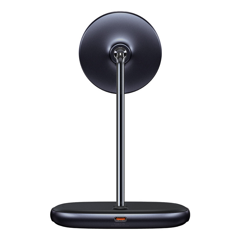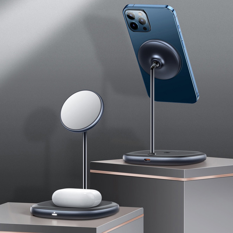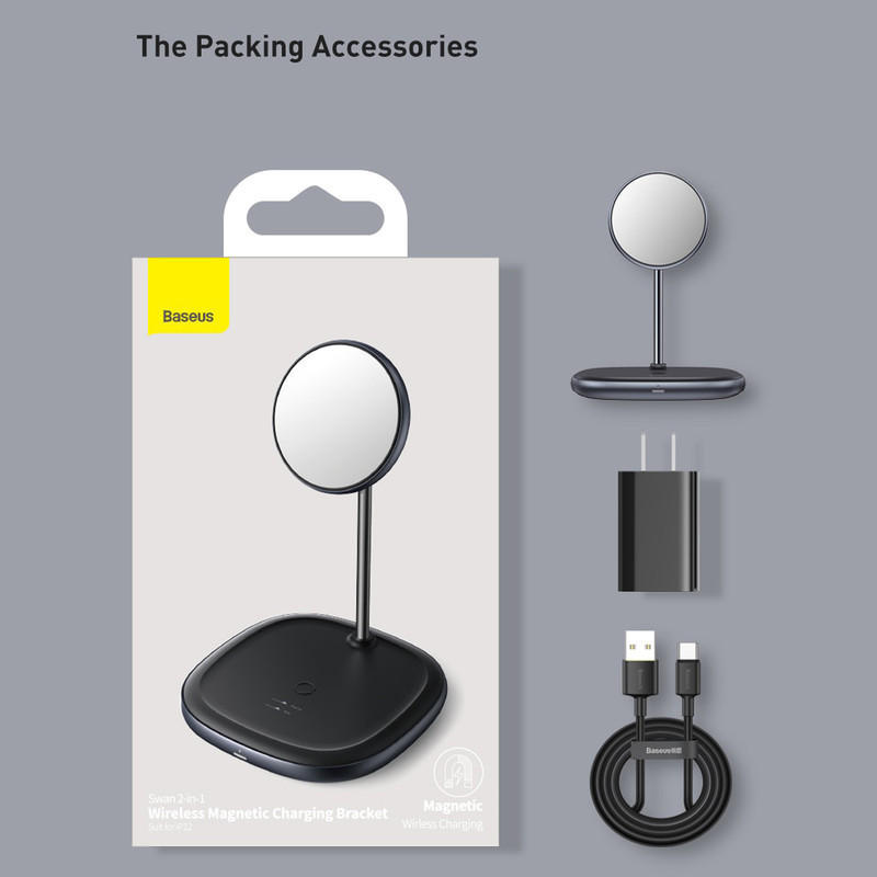 Swan 2-in-1 Wireless Magnetic Charging Bracket یک شارژر بیسیم و پایه نگهدارنده مگنتی از کمپانی بیسوس است که میتواند اکثر گوشیهای هوشمند سازگار با فناوری شارژ بیسیم را تغذیه نماید. حداکثر توان خروجی این دستگاه 20 وات میباشد. قسمت پایه به شکل پهن بوده و ساختار پد آن به صورتی است که با انواع گوشیهای سازگار با فناوری شارژ بیسیم Qi کار خواهد کرد. فقط کافی است که قسمت بالای آیفون را به پد نگهدارنده بچسبانید تا گوشی شما شروع به شارژ شدن نماید. پد نگهدارنده نیز قادر است علاوه بر نگهداشتن گوشی، دو مدل محبوب از گوشی های هوشمند اپل یعنی iPhone 12 و iPhone 13 را شارژ نماید. بدنه این استند از پلاستیک، استیل ضد زنگ و سیلیکون بوده و در قسمت نگهدارنده نیز یک آهنربا وجود دارد. وزن آن حدود 270 گرم و در ابعاد 106.5 × 106.5 × 158.2 میلیمتر طراحی شده است و به راحتی قابل حمل و جابجایی است. نشانگر LED که در جلوی دستگاه وجود دارد، وضعیت اتصال درست کابل USB و دریافت برق دستگاه را به شما اطلاع میدهد. درگاه ورودی این دستگاه USB-C بوده که با یک عدد کابل USB قابل اتصال به برق است. هر کدام از پد های شارژ بیسیم از توان مصرفی 10 وات بهره برده اند که در مجموع توان دستگاه را به 20 وات میرساند. ولتاژ و جریان ورودی Swan 2-in-1 Wireless Magnetic Charging Bracket برابر است با 9V-2A و 12V-2A. لازم به ذکر است شارژر بیسیم از تکنولوژی فست شارژ برای شارژ دستگاه ها استفاده میکند. همراه این محصول یک آداپتور فست شارژ و یک سیم 1 متری Type-c در بستهبندی قرار گرفته است.
