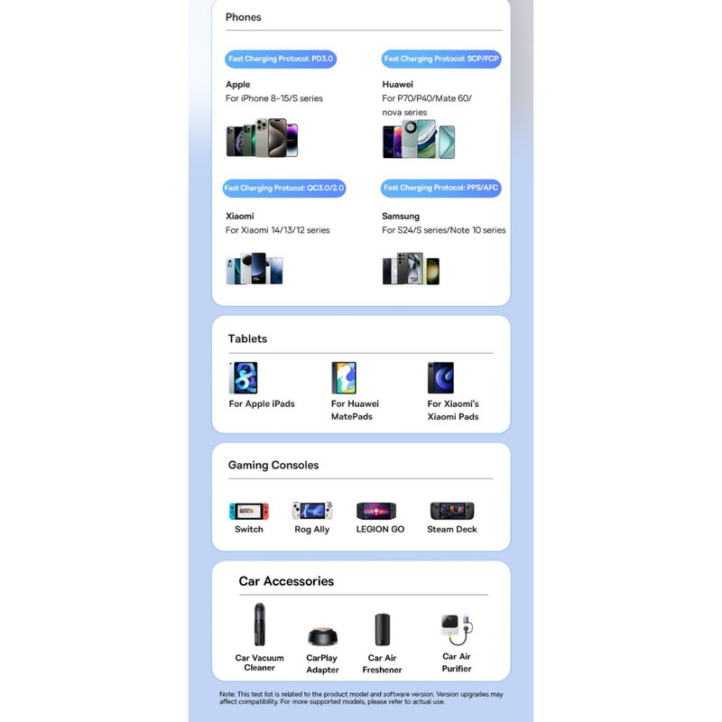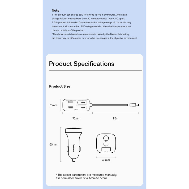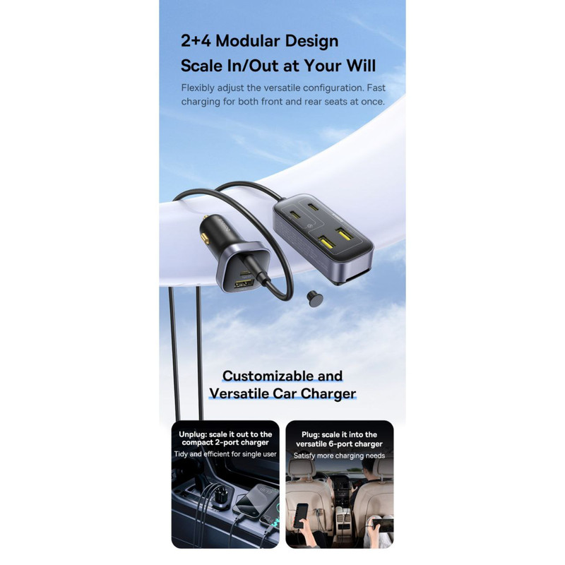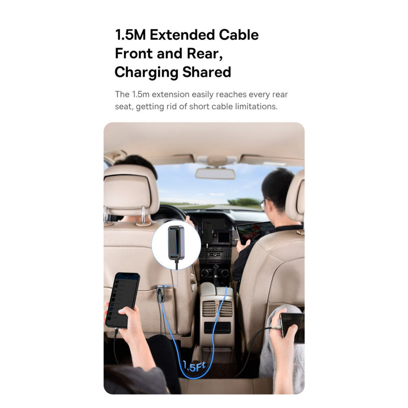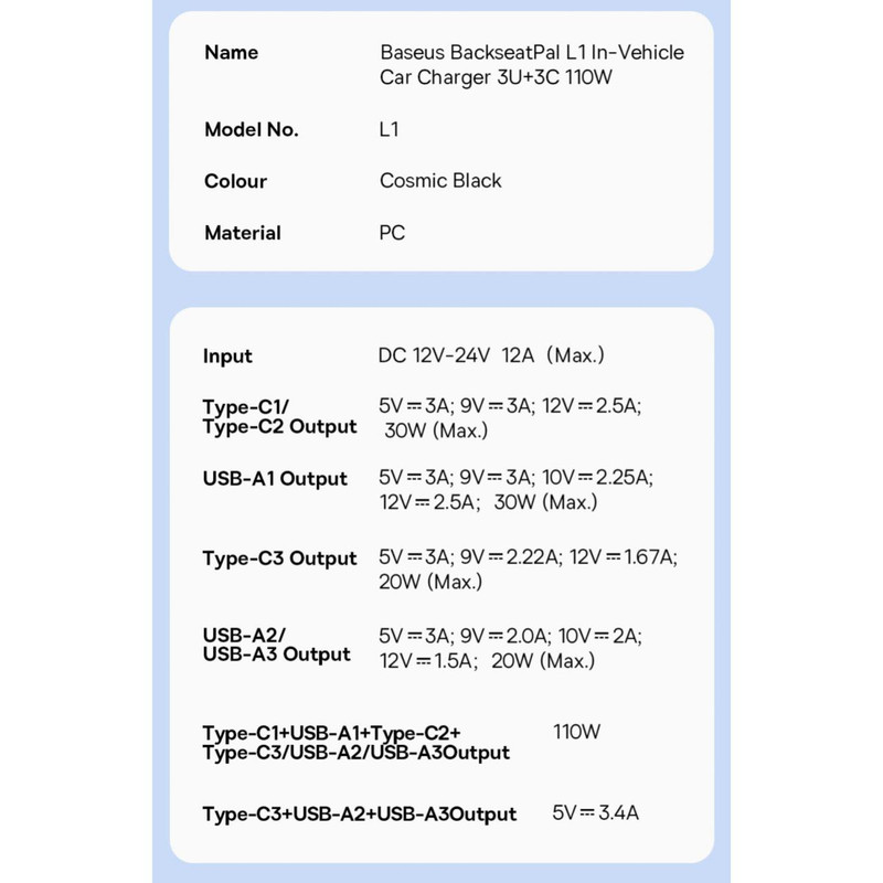 شارژر فندکی L1 دستگاهی کارآمد است که برای شارژ دستگاههای مختلف تلفن همراه در خودرو طراحی شده است. این شارژر از ورودی DC با حداکثر 12 ولت تا 24 ولت و 12 آمپر پشتیبانی میکند و چندین پورت خروجی از جمله Type-C و USB-A ارائه میدهد. پورتهای Type-C1 و Type-C2 حداکثر توان 30 وات را ارائه میدهند و از ولتاژهای 5 ولت 3 آمپر، 9 ولت 3 آمپر و 12 ولت 2.5 آمپر پشتیبانی میکنند. پورت USB-A1 از ولتاژهای 5 ولت 3 آمپر، 9 ولت 3 آمپر، 10 ولت 2.25 آمپر، 12 ولت 2.5 آمپر و همچنین تا 30 وات پشتیبانی میکند. پورت Type-C3 تا 20 وات توان با ولتاژهای 5 ولت 3 آمپر، 9 ولت 2.22 آمپر و 12 ولت 1.67 آمپر ارائه میدهد. علاوه بر این، پورتهای USB-A2 و USB-A3 حداکثر توان 20 وات را ارائه میدهند و از ولتاژهای مختلفی از جمله 5 ولت 3 آمپر، 9 ولت 2 آمپر، 10 ولت 2 آمپر، 12 ولت 1.5 آمپر پشتیبانی میکنند. همه پورتها روی هم رفته میتوانند تا 110 وات توان ارائه دهند که امکان شارژ همزمان چندین دستگاه را فراهم میکند. علاوه بر این، پورتهای Type-C3، USB-A2 و USB-A3 حداکثر جریان خروجی 5 ولت 3.4 آمپر را ارائه میدهند. شارژر فندکی L1 مخصوص ماشین طراحی شده است و با ظرفیتی تا ۱۱۰ وات، سه پورت USB-A و سه پورت USB-C را ارائه میدهد و به کاربران این امکان را میدهد که همزمان چندین دستگاه مانند تلفن، تبلت و لپتاپ را شارژ کنند. این محصول از شارژ سریع برای دستگاههایی با استاندارد PD 3.0 پشتیبانی میکند و به کاهش زمان شارژ کمک میکند. این شارژر فندکی با طراحی مناسب، نصب و استفاده آسان، انتخابی ایدهآل برای سفرهای طولانی است و برق کافی برای تمام دستگاههای تلفن همراه شما را تضمین میکند. توان تا ۱۱۰ وات: این شارژر با ظرفیت کلی ۱۱۰ وات، امکان شارژ سریع چندین دستگاه را به طور همزمان و بدون نیاز به شارژ بیش از حد فراهم میکند. این قابلیت برای سفرهای طولانی که نیاز به شارژ چندین دستگاه دارید، مفید است. با سیم رابط ۱.۵ متری: این فندک مجهز به یک سیم رابط ۱.۵ متری است که اتصال را آسانتر و انعطافپذیرتر میکند و به شما این امکان را میدهد که دستگاه خود را از صندلی عقب و بدون نیاز به نزدیک شدن به پریز برق شارژ کنید.