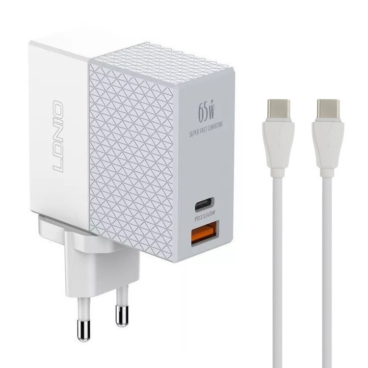 شارژر دیواری الدینیو LDNIO A2620C Fast Wall Charger با تکنولوژیهای مورد استفاده در آن بسیار کاربردی بوده و قابلیتهای خوبی را برای استفاده در اختیار شما قرار داده است تا بتوانید بدون اینکه نگران خراب شدن گوشی و وسیلههای خود باشید، از این شارژر استفاده کنید. ولتاژ ورودی شارژر دیواری الدینیو برابر با 100-240V است. روی بدنه این شارژر 2 پورت USB و Type C وجود دارد. اما خروجی و ولتاژ آنها با یکدیگر متفاوت هستند. درگاه تایپ سی دارای ولتاژ و شدت جریان خروجی برابر با: 5V~3A / 9V~3A / 12V~3A / 15V~2.5A / 20V~3.25A هستند و حداکثر توان خروجی از این پورت برابر با 65 وات است. درگاه یو اس بی نیز دارای ولتاژ و شدت جریان خروجی 5V~2.4A است و توان خروجی حداکثری آن هم برابر با 12 وات است. توجه داشته باشید که در صورت استفاده همزمان از درگاهها، حداکثر توان خروجی از شارژر دیواری الدینیو A2620C برابر با 57 وات خواهد شد که در این حالت، خروجی درگاه یو اس بی برابر با 12 وات و خروجی درگاه تایپ سی نیز برابر با 45 وات است. این شارژر از قابلیت PD3.0 نیز بهره برده است و همین مورد سبب شده تا بتوانید بازه گستردهتری از وسایل را شارژ نمایید. برای اینکه خیال کاربران هنگام استفاده از این شارژر راحت باشد، استانداردهای ایمنی مختلفی نیز برای آن در نظر گرفته شده است. برای مثال: ایمنی اتصال کوتاه، جلوگیری از گرم شدن بیش از اندازه، جلوگیری از عبور بیش از اندازه جریان و... از جمله استانداردهای مختلف به کار رفته در این دستگاه هستند. جنس استفاده شده برای ساخت این شارژر از PC و آلیاژ آلومینیوم است که مقاومت مطلوبی را برای آن ایجاد کرده است. همین متریال استفاده شده در شارژر سبب شده تا مقاومت آن در برابر حرارت حداکثر تا دمای 850 درجه سانتیگراد باشد. نوع دوشاخه استفاده شده در این شارژر دیواری EU است و مطابق با پریزهای ایرانی خواهد بود، بنابراین نیازی به تبدیل نخواهید داشت. طراحی این دو شاخه به گونهای است که میتوان آن را به راحتی برداشته و از تبدیلی که مناسب با کانکتورهای آن باشد، استفاده نمود و برای مثال دوشاخه را به سه شاخه تبدیل کرد و مورد استفاده قرار داد. گفتنی است که همراه با این شارژر، یک کابل تایپ سی نیز قرار داده شده است.