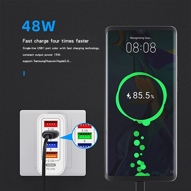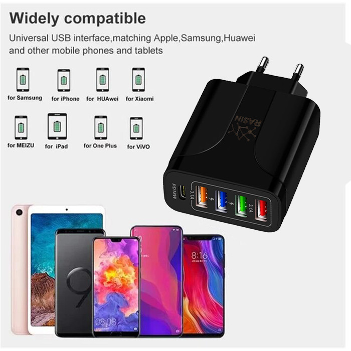 با استفاده از مدل F002 از سری شارژرهای دیواری راسین میتوانید باتری گوشی موبایل خود را شارژ کنید. توان این شارژر دیواری 48 وات است.دارای چهار درگاه خروجی USB , یک درگاه TYPE C - که PD است و میتوان باتری پنج دستگاه گوشی موبایل، تبلت، دوربین دیجیتال، موزیکپلیر و... را به صورت همزمان سریع شارژ کرده و در وقتتان صرفهجویی کنید. برای استفاده از این شارژر کافی است آن را به طور مستقیم به پریز برق خانه یا محل کارتان متصل کنید؛ سپس گوشی موبایل یا دیگر دستگاههای سازگار را با استفاده از یک کابل USB به خروجی شارژر متصل کرده و منتظر بمانید تا باتری آن شارژ شود. جنس F002 از پلاستیک ABS با کیفیت بالا ساخته شده است. مدل «F002» دارای قابلیت Power IQ است که شدتجریان دستگاه شما را به صورت هوشمند تشخیص میدهد ، در ضمن دوشاخهی بهکاررفته در آن هم با پریزهای برق ایران سازگاری دارد.