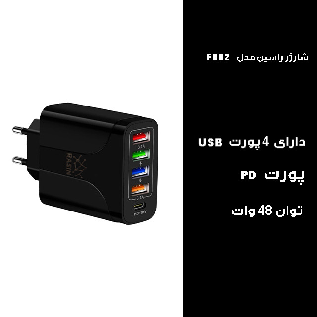 با استفاده از مدل F002 از سری شارژرهای دیواری راسین میتوانید باتری گوشی موبایل خود را شارژ کنید. توان این شارژر دیواری 48 وات است.دارای چهار درگاه خروجی USB , یک درگاه TYPE C - که PD است و میتوان باتری پنج دستگاه گوشی موبایل، تبلت، دوربین دیجیتال، موزیکپلیر و... را به صورت همزمان سریع شارژ کرده و در وقتتان صرفهجویی کنید. برای استفاده از این شارژر کافی است آن را به طور مستقیم به پریز برق خانه یا محل کارتان متصل کنید؛ سپس گوشی موبایل یا دیگر دستگاههای سازگار را با استفاده از یک کابل USB به خروجی شارژر متصل کرده و منتظر بمانید تا باتری آن شارژ شود. جنس F002 از پلاستیک ABS با کیفیت بالا ساخته شده است. مدل «F002» دارای قابلیت Power IQ است که شدتجریان دستگاه شما را به صورت هوشمند تشخیص میدهد ، در ضمن دوشاخهی بهکاررفته در آن هم با پریزهای برق ایران سازگاری دارد.