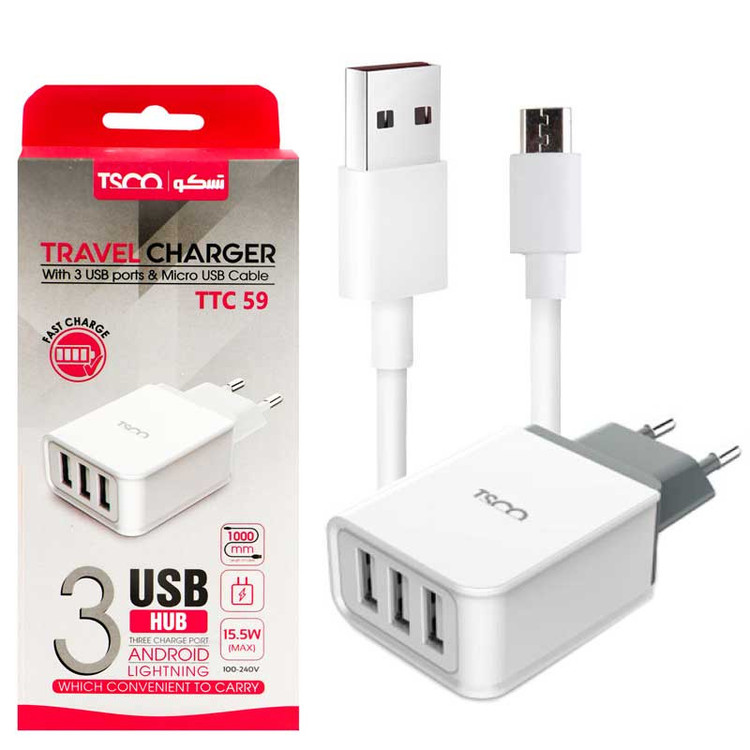 مشکل کمبود پریز را در هنگام شارژ همزمان گوشی، تبلت، هدست و پاوربانک، چگونه برطرف می کنید؟ یکی از بهترین راه های رفع این مشکل، استقاده از شارژ دیواری با تعداد پورت بالاست . شارژر دیواری TTC 59 محصولی سه پورت USB با شدت جریان 3.1 آمپر از شرکت تسکو است که دارای طراحی بسیار ساده است اما از کیفیت بالایی برخوردار می باشد .دو شاخهی شارژر دیواری TTC 59 با پریزهای برق منزلهای ما سازگار است و ولتاژ ورودی آن در محدوده 100 تا 240 ولت متناوب است.این محصول طول و عرض آن به ترتیب 54 و 43 میلیمتر است. چون جنس آن از پلاستیک ABS و PC است وزن دارد. ازآنجایی که ولتاژ خروجی آن 5 ولت است فقط دستگاههایی به کمک آن شارژ میشوند که ولتاژ 5 ولتی داشته باشند. این شارژر دیواری برای افرادی مناسب است که میخواهند با شارژ همزمان دستگاههای خود در زمان صرفهجویی کنند.