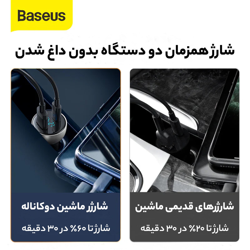 با همراه داشتن شارژر فندکی، دیگر در مسیر های طولانی نگران خاموش شدن گوشی همراهتان نخواهید بود زیرا می توانید به راحتی گوشی خود را با استفاده از آن ها در اتومبیل شارژ کنید. شارژر فندکی بیسوس Baseus Digital Dual 65W PPS Dual Quick Charger محصولی از کمپانی Baseus بوده که از خاموش شدن گوشی شما در اتومبیل جلوگیری می کند و به شما این امکان را می دهد تا بتوانید دو گوشی موبایل را به طور همزمان شارژ کنید. با قبلیت سوپر فست شارژی هم که در آن قرار دارد، شارژ کردن گوشی های فست شارژ با سرعت بسیار بالا صورت می گیرد و به خوبی در وقت صرفه جویی می شود. شما با استفاده از این محصول می توانید به راحتی دو گوشی موبایل را به طور همزمان شارژ کنید و این را مدیون دو پورت خروجی این شارژر فندکی هستیم که یکی از آن ها درگاه خروجی USB و دیگری درگاه Type-C است. Baseus CCKX-C0A با تون خروجی حداکثر 65 واتی خود، می تواند از شارژ گوشی های هواوی نیز که قابلیت سوپر فست شارژ دارند، پشتیبانی کرده و آن ها را هم به راحتی شارژ نماید. در این رابطه باید به این نکته نیز توجه داشته باشید که شدت جریان و ولتاژ پورت USB برابر است با 5V-5A / 5V-4.5A / 5V-3A / 9V-3A / 12V-2.5A / 20V-1.5A و شدت جریان و ولتاژ خروجی از درگاه تایپ سی شارژر فندکی هم برابر با 5V-3A / 9V-3A / 12V-3A / 15V-3A / 20V-3.25A است که هنگام استفاده از هر دوی پورت ها، مجموعاً 65 وات خروجی کلی شارژر فندکی را تشکیل می دهند.