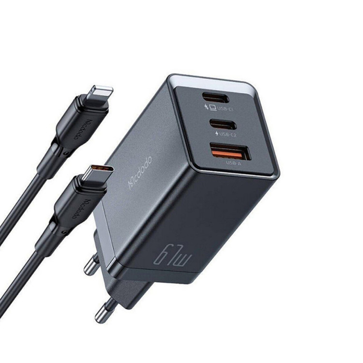 شارژر دیواری67 وات به همراه کابل لایتنینگ مک دودو CH-1544 یک گزینه عالی برای کاربرانی است که به دنبال شارژ سریع و کارآمد برای دستگاههای مختلف خود هستند. این محصول از فناوریهای پیشرفته و طراحی مدرن بهره میبرد که آن را به یکی از بهترین انتخابها در بازار تبدیل کرده است.این شارژر مجهز به دو پورت Type-C و یک پورت USB-A است که به شما امکان میدهد تا به طور همزمان چندین دستگاه را شارژ کنید. این ویژگی، مناسب برای افرادی است که نیاز به شارژ همزمان گوشی، تبلت و دیگر دستگاهها دارند.این شارژر با توان خروجی 67 وات، قادر است به سرعت دستگاههای مختلف از جمله گوشیهای هوشمند، تبلتها و لپتاپها را شارژ کند. این ویژگی برای افرادی که به سرعت و کارآیی بالا در شارژ دستگاههای خود نیاز دارند، بسیار مناسب است. استفاده از فناوری GaN در این شارژر، به کاهش اندازه و وزن دستگاه کمک کرده و همچنین کارایی و حرارت کمتر آن را تضمین میکند.طراحی فشرده و سبک شارژر باعث میشود که حمل و نقل آن بسیار آسان باشد و فضای کمی را اشغال کند. این ویژگی برای مسافرتها و استفاده در محیطهای مختلف بسیار مناسب است