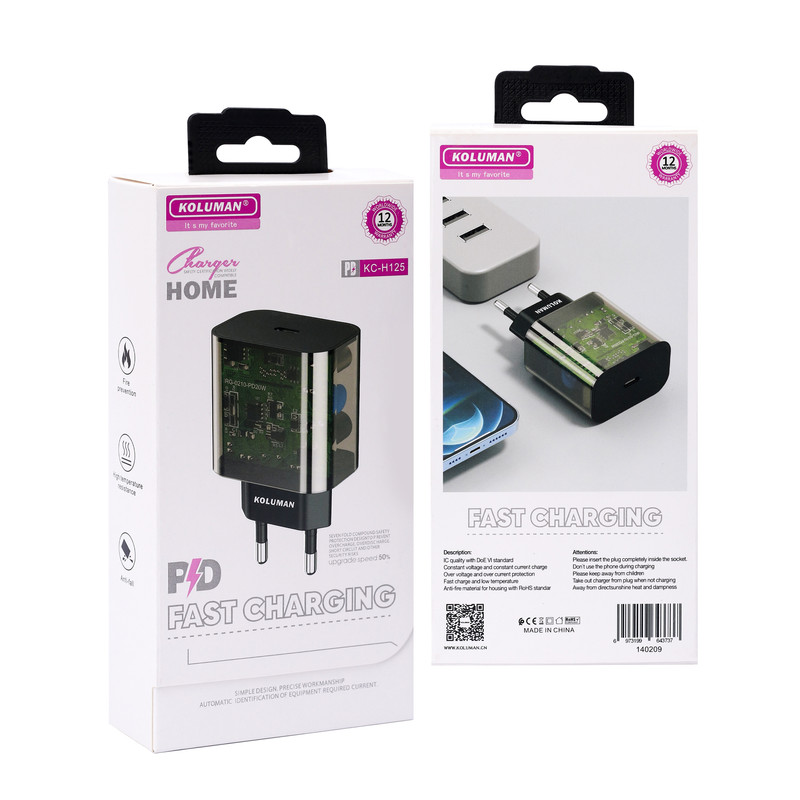 امروزه یکی از دغدغه های هر فرد سریع شارژ شدن تلفن همراه و دستگاه های هوشمند با کمترین اسیب میباشد . بزرگترین عامل حفظ سلامت این دستگاه ها استفاده از شارژر مناسب میباشد. شرکت کلومن با در نظر گرفتن این دغدغه،شارژر مدل KC-H125 خود را ارائه کرده است . این شارژر با توان خروجی 20 وات ،دارای یک پورت شارژ PD میباشد . خروجی PD این شارژر با توان 20 وات خود و ولتاژ خروجی (5V/3A, 9V/2.22A )گوشی شما را سریع شارژ میکند . توان خروجی کلی این اداپتور 20 وات بوده و با فناوری AUTO ID مقدار جریان مناسب برای گوشی را شناسایی کرده و از اسیب دیدن باطری دستگاه شما جلوگیری میکند. این شارژر با فناوری SEVEN FOLD COMPOND خود دستگاه شما را از SHORT CIRCUIT،OVERCHARGE و دیگر مشکلات محافظت میکند. . بدنه این اداپتور شفاف بوده و در برابر حرارت مقاومت بالایی از خود نشان میدهد . این شارژر دارای تاییدیه های FC,CE و ROHS میباشد .