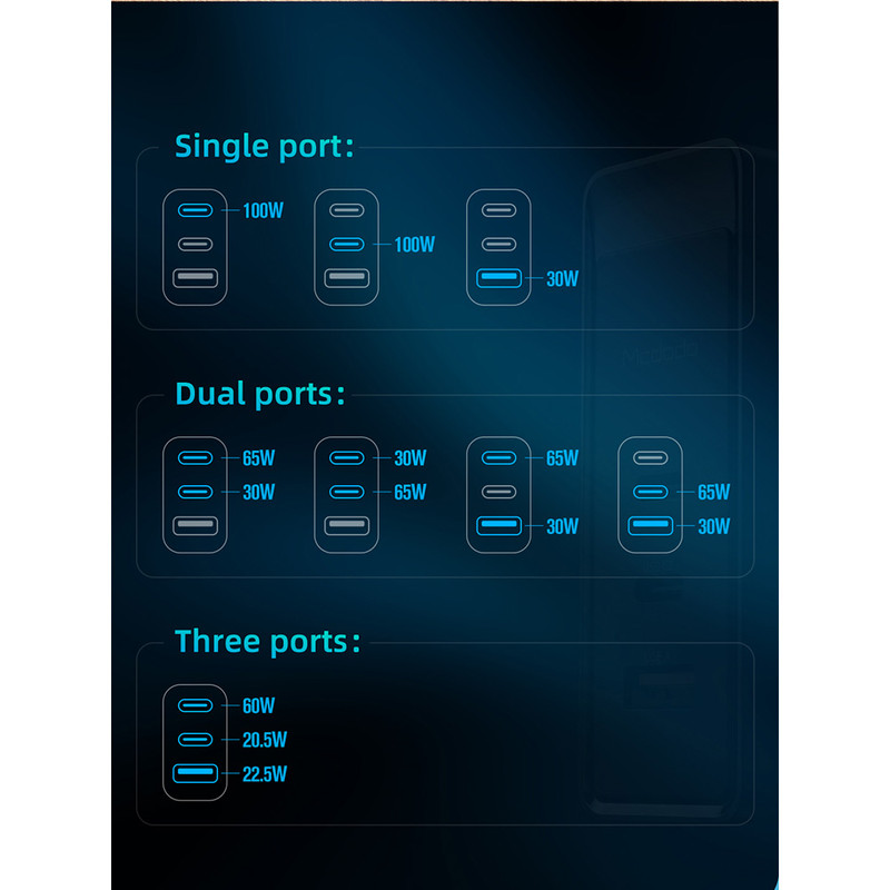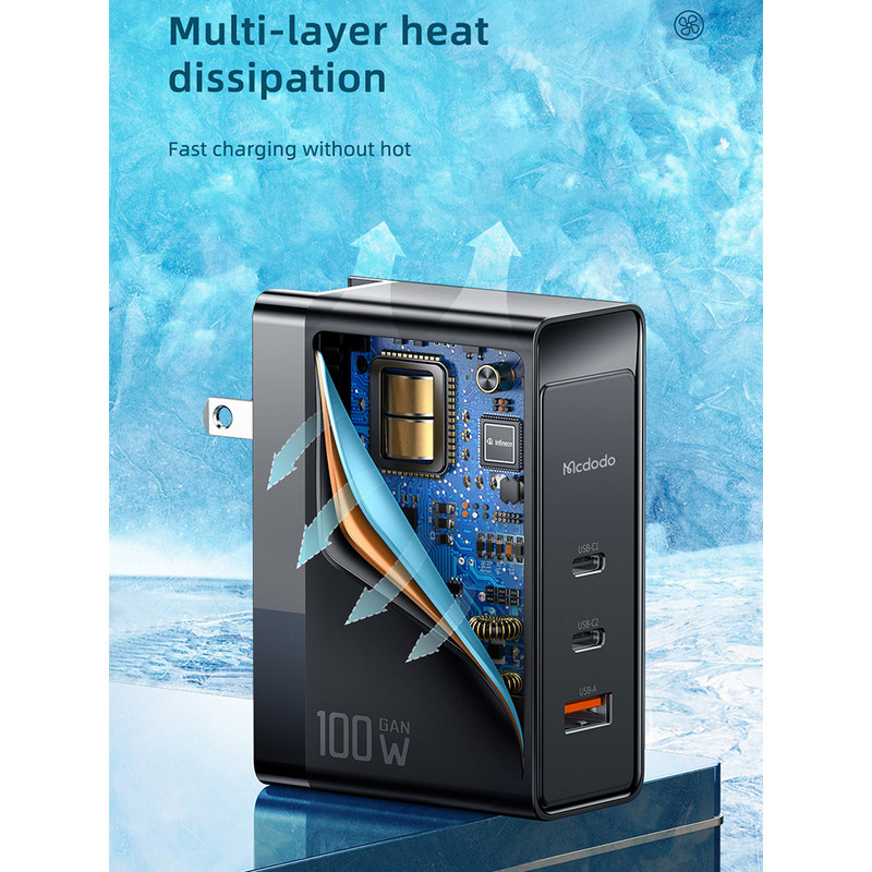 شارژر دیواری 100 وات مک دودو مدل GaN 100W 3-Port بهمراه تبدیل برق از جنس Fireproof PC (ضدحریق و نسوز) با تکنولوژی روز ساخته شده است.این شارژر دارای سه خروجی شامل دو پورت تایپ سی و یک پورت USB است.این شارژر مک دودود با کدهای CH-8101 و CH-8101 PRO به همراه دو تبدیل برق شهری مطابق تصویر ارائه میگردد که از 12 نوع فناوری شارژ سریع حمایت میکند.این محصول از فناوری GaN (GaN در واقع خلاصه شدهی Gallium Nitride یا گالیوم نیترید است که یکی از مواد نیمه رسانای جدید محسوب میشود. از جمله ویژگیهای این ماده میتوان به پهنای باند بالا، رسانایی گرمایی زیاد، مقاومت گرمایی زیاد، مقاوم تابشی، مقاومت در برابر اسید و قدرت و استحکام بالا اشاره کرد) بهره مند است که از به روزترین فناوری های شارژر میباشد.میزان توان خروجی هر پورت در توضیحات و تصاویر امده است.این شارژر دیواری از سری Fast Charger Universal محصولات مک دودو می باشد.شارژر Mcdodo محافظت 9 لایه ای ارائه می دهد تا با خیال آسوده از آن استفاده کنید.این آداپتور در برابر توان، دما، ولتاژ،جریان و شارژ بیش از اندازه از گوشی شما محافظت می کند. همچنین جلوی اتصال کوتاه را می گیرد و جرقه نمی زند.خروجی تایپ سی به تنهایی از فناوریهای:Type-C supports PD2.0, PD3.0, QC3.0, QC4.0, FCP, Apple 2.4A, Samsung AFC, BC1.2 پشتیبانی کرده و پورت USB از :USB-A supports QC2.0, QC3.0, FCP, SCP, Apple 2.4A, Samsung AFC, BC1.2 پشتیبانی می کند.امکان شارژ همزمان سه دستگاه را دارد.(بستگی به کابل مورد استفاده و توانایی دستگاه کاربر)