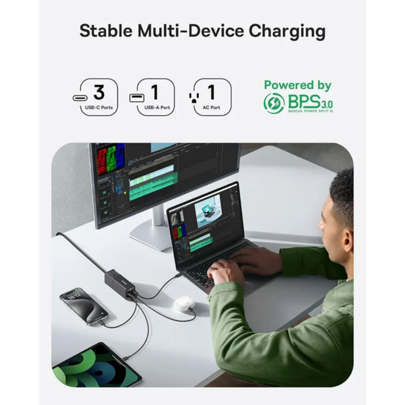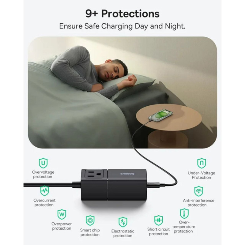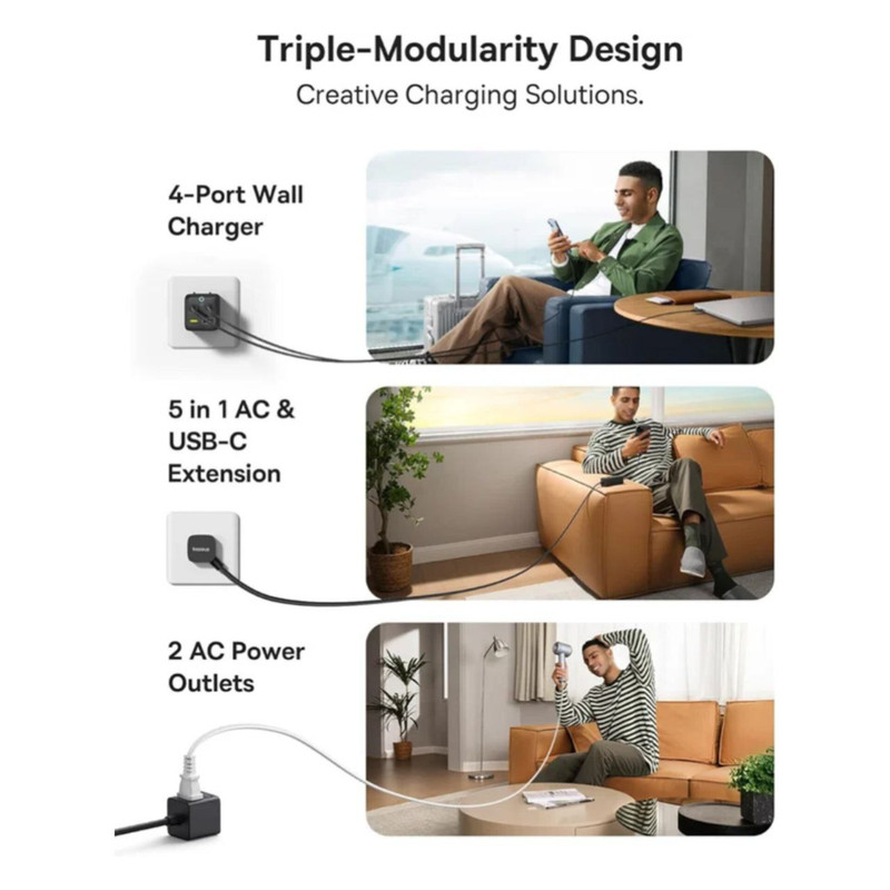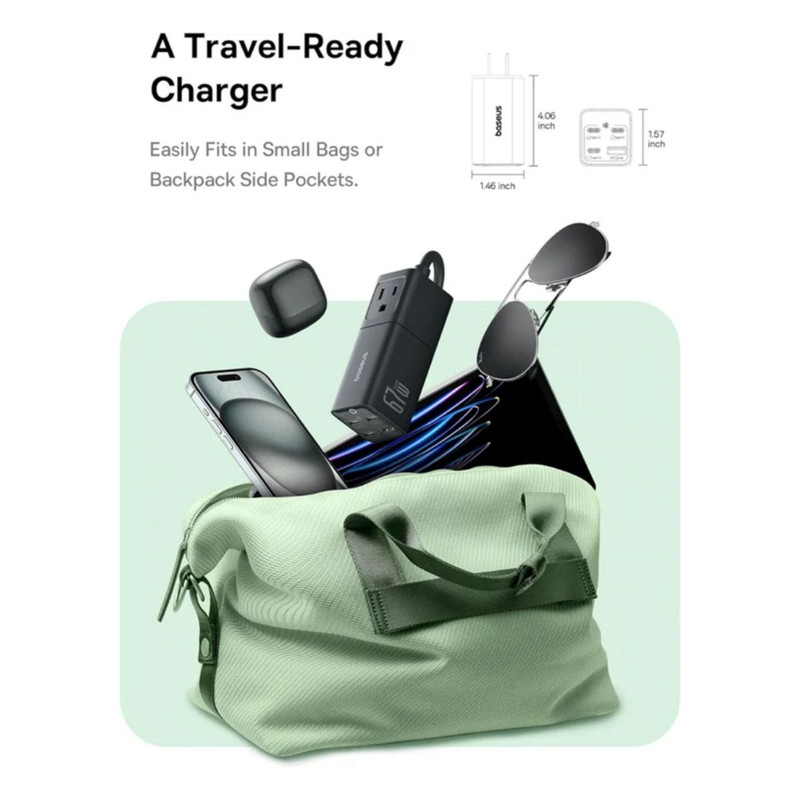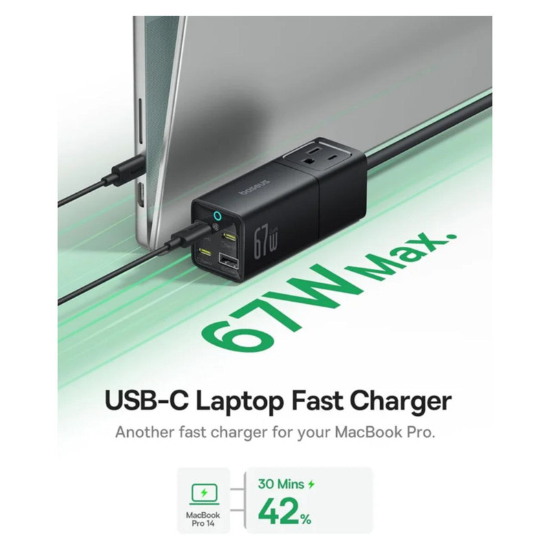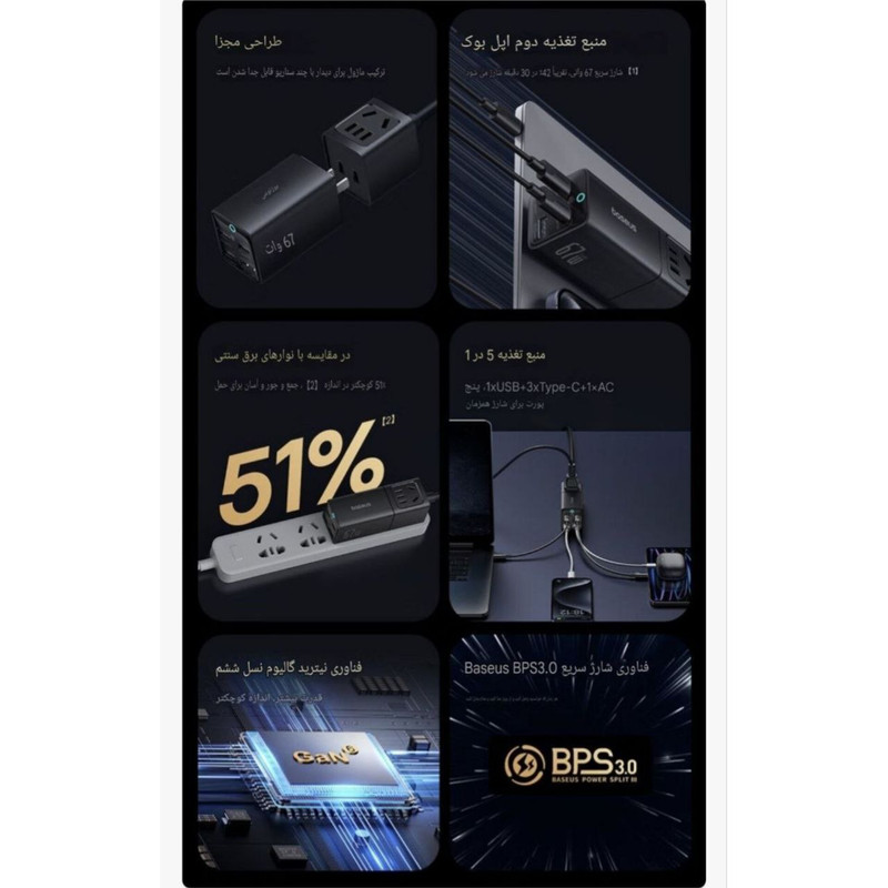 طراحی شگفت انگیز شارژر جدید بیسوس قابل جدا شدن با هدف ارائه یک راه حل برق همه کاره و قابل حمل برای مسافران است، شما می توانید از این ایستگاه شارژ به 3 روش مختلف استفاده کنید: یک شارژر دیواری 4 پورت، یک سیم کشی 5 فوتی با 2 خروجی، یا یک نوار برق سفری 5 در 1. جمع و جور و سبک است که می توانید آن را در هر جایی از کیف خود حمل کنید!شارژر سریع USB C مک بوک پرو 14 اینچی شما را تا 42 درصد و آیفون 15 تا 50 درصد را تنها در 30 دقیقه با توان خروجی چشمگیر 67 وات قدرت می دهد. همچنین از منبع تغذیه قابل برنامه ریزی (PPS) برای سازگاری با Samsung Super Fast Charging 2.0 پشتیبانی می کند. شارژ سریع USB-C: با 3 پورت USB-C 67 واتی در جلو، می توانید تقریباً هر چیزی از جمله تلفن، تبلت یا لپ تاپ خود را با سرعت بالا شارژ کنید. توجه: 3 پورت USB-C در صورت استفاده همزمان در مجموع 60 وات مشترک هستند. فناوری GaN6 وBPS3 : این شارژر GaN از فناوری GaN6 استفاده می کند که عملکرد قدرتمندتر را با نرخ تبدیل انرژی بالاتر در اندازه بسیار کوچکتر تضمین می کند. و BPS3.0 می تواند به صورت پویا قدرت شارژ را برای شارژ پایدار چند دستگاه اختصاص دهد و تجربه شارژی را برای شما به ارمغان بیاورد که قبلاً هرگز نداشته اید. سازگار گسترده با دستگاههای مختلف: شارژر بیسوس میتواند دستگاه های مختلف از جمله لپتاپ، تلفنهای هوشمند، تبلت، هدفون و غیره را به سرعت شارژ کند. پریزهای برق متناوب همچنین با وسایل برقی مانند مینی پروژکتور، مانیتور، چاپگر، لامپ و غیره سازگار هستند. جمع و جور و قابل حمل: فناوری GaN6 عملکرد قدرتمندتر را با نرخ تبدیل انرژی بالاتر در اندازه بسیار کوچکتر تضمین می کند، می توانید آن را در هر جایی از کیف خود حمل کنید!