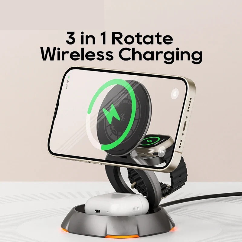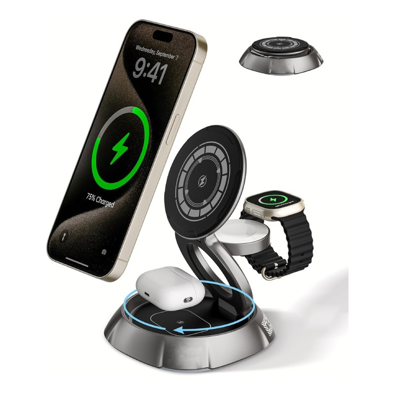 داک شارژ بی سیم مدل CD72 قابل چرخش 3 در 1 یک راهکار ایدهآل برای کاربران اپل است که به دنبال یک ایستگاه شارژ همهکاره هستند. این دستگاه با امکان شارژ همزمان آیفون، اپل واچ و ایرپادها، تجربهای منظم و بدون دردسر را فراهم میکند. طراحی تاشو، قابلیت چرخش 360 درجه و فناوریهای ایمنی پیشرفته از جمله ویژگیهای برجسته این محصول هستند که آن را به گزینهای مناسب برای محیط کار، خانه یا سفر تبدیل کردهاند.این داک شارژ به شما امکان میدهد سه دستگاه اپل را بهطور همزمان و بدون نیاز به کابلهای متعدد شارژ کنید. این ویژگی باعث نظم بیشتر در فضای کار شده و از درهمریختگی جلوگیری میکند. مدلهای آیفون سازگار با این دستگاه شامل iPhone 15/14/13/12 در نسخههای Pro، Pro Max، Plus و Mini هستند. همچنین، این شارژر برای تمام مدلهای اپل واچ از سری 1 تا Ultra 2 و ایرپادهای Pro، 3 و 2 مناسب است. بنابراین، کاربران میتوانند با یک راهکار جامع، تمام دستگاههای خود را بهصورت یکجا شارژ کنند.یکی از ویژگیهای برجسته این داک شارژ، طراحی تاشو و قابلحمل آن است که آن را به گزینهای ایدهآل برای جابهجایی تبدیل میکند. ابعاد جمعوجور و وزن سبک باعث میشود بتوانید آن را بهراحتی در کیف یا چمدان خود قرار دهید و در هر مکانی از آن استفاده کنید. علاوه بر این، طراحی آن به شما امکان میدهد گوشی خود را در حالت عمودی یا افقی قرار داده و هنگام شارژ، به تماشای ویدئو یا انجام تماسهای تصویری بپردازید.پایه چرخشی 360 درجه این شارژر، تجربهای متفاوت و کاربردی را ارائه میدهد. با چرخش نرم و دقیق، کاربران میتوانند زاویه دلخواه خود را برای استفاده از گوشی یا ساعت هوشمند تنظیم کنند. طراحی این قسمت به گونهای است که هنگام چرخش، صدایی مشابه کلیک ساعت مکانیکی ایجاد میشود که حس حرفهای بودن را افزایش میدهد. این قابلیت نهتنها دسترسی به دستگاهها را راحتتر میکند، بلکه از گره خوردن کابلها جلوگیری کرده و استفاده از شارژر را به تجربهای لذتبخش تبدیل میکند.داک شارژ CD72 علاوه بر طراحی جذاب، از نظر ایمنی نیز عملکردی قابلاطمینان دارد. این دستگاه دارای گواهینامه FCC بوده و از فناوریهای ایمنی متعددی بهره میبرد. سیستم کنترل دما باعث جلوگیری از افزایش حرارت بیش از حد دستگاهها میشود.