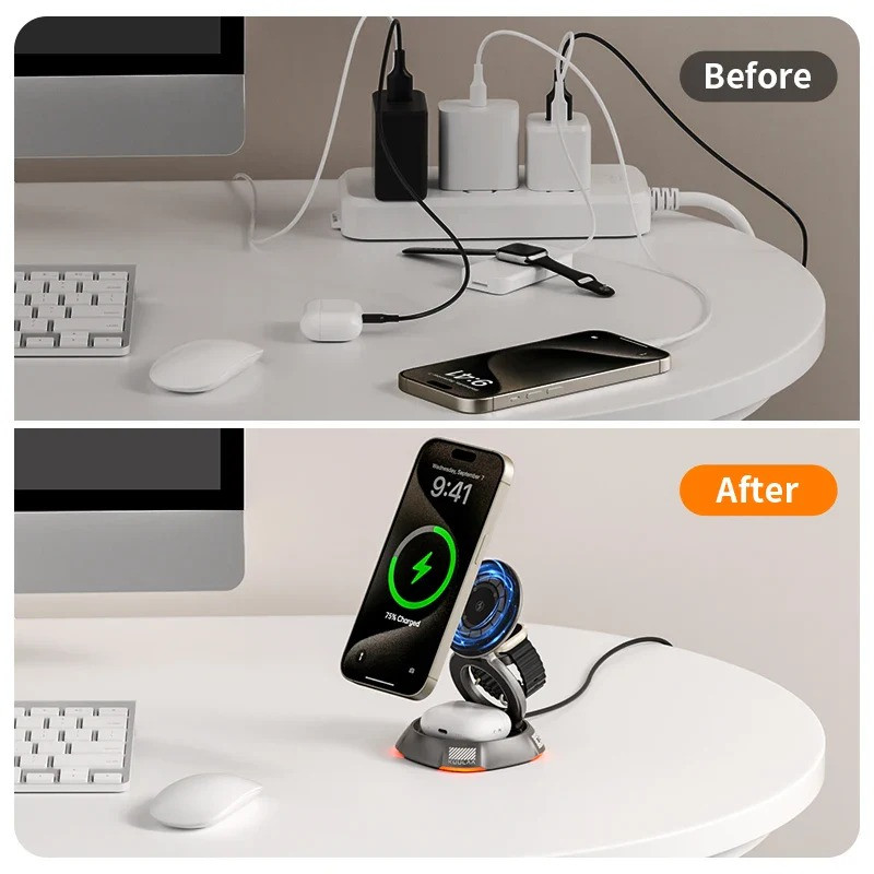 داک شارژ بی سیم مدل CD72 قابل چرخش 3 در 1 یک راهکار ایدهآل برای کاربران اپل است که به دنبال یک ایستگاه شارژ همهکاره هستند. این دستگاه با امکان شارژ همزمان آیفون، اپل واچ و ایرپادها، تجربهای منظم و بدون دردسر را فراهم میکند. طراحی تاشو، قابلیت چرخش 360 درجه و فناوریهای ایمنی پیشرفته از جمله ویژگیهای برجسته این محصول هستند که آن را به گزینهای مناسب برای محیط کار، خانه یا سفر تبدیل کردهاند.این داک شارژ به شما امکان میدهد سه دستگاه اپل را بهطور همزمان و بدون نیاز به کابلهای متعدد شارژ کنید. این ویژگی باعث نظم بیشتر در فضای کار شده و از درهمریختگی جلوگیری میکند. مدلهای آیفون سازگار با این دستگاه شامل iPhone 15/14/13/12 در نسخههای Pro، Pro Max، Plus و Mini هستند. همچنین، این شارژر برای تمام مدلهای اپل واچ از سری 1 تا Ultra 2 و ایرپادهای Pro، 3 و 2 مناسب است. بنابراین، کاربران میتوانند با یک راهکار جامع، تمام دستگاههای خود را بهصورت یکجا شارژ کنند.یکی از ویژگیهای برجسته این داک شارژ، طراحی تاشو و قابلحمل آن است که آن را به گزینهای ایدهآل برای جابهجایی تبدیل میکند. ابعاد جمعوجور و وزن سبک باعث میشود بتوانید آن را بهراحتی در کیف یا چمدان خود قرار دهید و در هر مکانی از آن استفاده کنید. علاوه بر این، طراحی آن به شما امکان میدهد گوشی خود را در حالت عمودی یا افقی قرار داده و هنگام شارژ، به تماشای ویدئو یا انجام تماسهای تصویری بپردازید.پایه چرخشی 360 درجه این شارژر، تجربهای متفاوت و کاربردی را ارائه میدهد. با چرخش نرم و دقیق، کاربران میتوانند زاویه دلخواه خود را برای استفاده از گوشی یا ساعت هوشمند تنظیم کنند. طراحی این قسمت به گونهای است که هنگام چرخش، صدایی مشابه کلیک ساعت مکانیکی ایجاد میشود که حس حرفهای بودن را افزایش میدهد. این قابلیت نهتنها دسترسی به دستگاهها را راحتتر میکند، بلکه از گره خوردن کابلها جلوگیری کرده و استفاده از شارژر را به تجربهای لذتبخش تبدیل میکند.داک شارژ CD72 علاوه بر طراحی جذاب، از نظر ایمنی نیز عملکردی قابلاطمینان دارد. این دستگاه دارای گواهینامه FCC بوده و از فناوریهای ایمنی متعددی بهره میبرد. سیستم کنترل دما باعث جلوگیری از افزایش حرارت بیش از حد دستگاهها میشود.