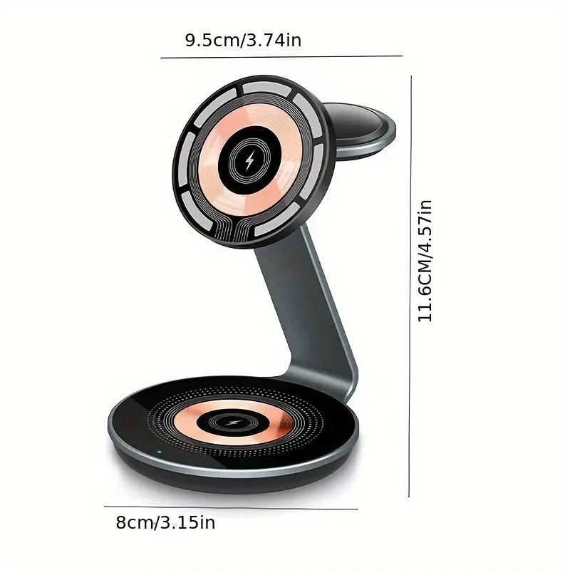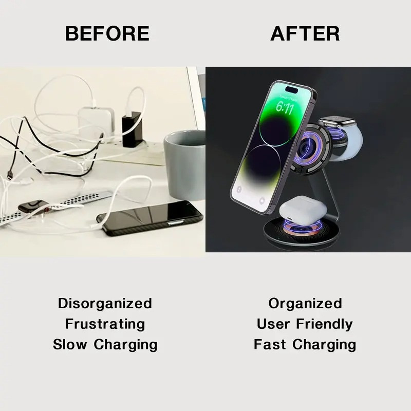 شارژ رومیزی مدل 3in1 Wireless charger XQ-01 که برای شارژ بی سیم دو دستگاه دیجیتال به طور همزمان طراحی شده است، یک محصول راه حل محور است. با 15 وات قدرت شارژ سریع، دیگر نگران زمان شارژ نباشید! سهولت شارژ 3 در 1: با 3 پد شارژ بی سیم مجزا می توانید به راحتی برق 3 دستگاه جداگانه را تامین کنید. اگر تا به حال خود را با هدفون ها و یا ساعت های هوشمند در حال خاموش شدن و یک تلفن در حال خاموشی پیدا کردید، این محصول راه حلی است برای شارژ آسان هر سه دستگاه شما. این محصول با دقت و با اندازه گیری ها و زوایای مناسب ساخته شده است تا به راحتی هر دو دستگاه را در حین شارژ بی سیم قرار دهد. یک پایه بلند روی پد شارژ بالایی برای نگه داشتن سایر دستگاه ها نیز تعبیه شده است. شما میتوانید از فناوری MagSafe اپل استفاده کنید که به آیفون 12 و جدیدتر اجازه میدهد تا برای شارژ آسانتر و سریعتر به صورت مغناطیسی با پد شارژ بیسیم هماهنگ شوند و همچنین می توان بدون سازگاری MagSafe از طریق دستگاه های دارای Qi یا حلقه های مغناطیسی از این محصول برای شارژ موبایل خود استفاده کنید. این محصول طراحی شده برای به حداقل رساندن بهم ریختگی با ارائه قدرت شارژ در یک مکان، طراحی شده تا دستگاه های شما را در یک محل نگه دارد و به دلیل طراحی دقیق آن، فضای کمتری را اشغال کند. شارژ رومیزی مدل 3in1 Wireless charger XQ-01 که در زمان و هزینه شما صرفه جویی می کند، برای حل مشکلات متعدد ساخته شده است. این محصول آماده است تا تمام دستگاه های شما را به راحتی در یک مکان شارژ کند. سپس وقتی کارتان تمام شد، می توان آن را به راحتی بسته بندی کرد و کنار گذاشت زیرا فضای کمی را اشغال می کند. ایده آل برای سفر، کار، رفت و آمد و حتی فقط در خانه میباشد.