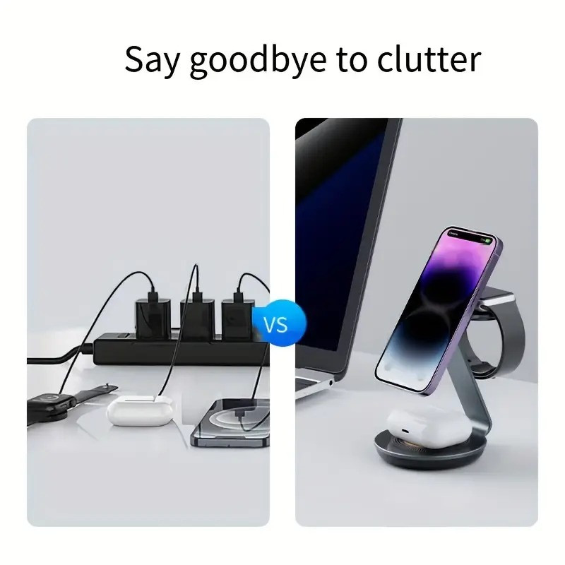 شارژ رومیزی مدل 3in1 Wireless charger XQ-01 که برای شارژ بی سیم دو دستگاه دیجیتال به طور همزمان طراحی شده است، یک محصول راه حل محور است. با 15 وات قدرت شارژ سریع، دیگر نگران زمان شارژ نباشید! سهولت شارژ 3 در 1: با 3 پد شارژ بی سیم مجزا می توانید به راحتی برق 3 دستگاه جداگانه را تامین کنید. اگر تا به حال خود را با هدفون ها و یا ساعت های هوشمند در حال خاموش شدن و یک تلفن در حال خاموشی پیدا کردید، این محصول راه حلی است برای شارژ آسان هر سه دستگاه شما. این محصول با دقت و با اندازه گیری ها و زوایای مناسب ساخته شده است تا به راحتی هر دو دستگاه را در حین شارژ بی سیم قرار دهد. یک پایه بلند روی پد شارژ بالایی برای نگه داشتن سایر دستگاه ها نیز تعبیه شده است. شما میتوانید از فناوری MagSafe اپل استفاده کنید که به آیفون 12 و جدیدتر اجازه میدهد تا برای شارژ آسانتر و سریعتر به صورت مغناطیسی با پد شارژ بیسیم هماهنگ شوند و همچنین می توان بدون سازگاری MagSafe از طریق دستگاه های دارای Qi یا حلقه های مغناطیسی از این محصول برای شارژ موبایل خود استفاده کنید. این محصول طراحی شده برای به حداقل رساندن بهم ریختگی با ارائه قدرت شارژ در یک مکان، طراحی شده تا دستگاه های شما را در یک محل نگه دارد و به دلیل طراحی دقیق آن، فضای کمتری را اشغال کند. شارژ رومیزی مدل 3in1 Wireless charger XQ-01 که در زمان و هزینه شما صرفه جویی می کند، برای حل مشکلات متعدد ساخته شده است. این محصول آماده است تا تمام دستگاه های شما را به راحتی در یک مکان شارژ کند. سپس وقتی کارتان تمام شد، می توان آن را به راحتی بسته بندی کرد و کنار گذاشت زیرا فضای کمی را اشغال می کند. ایده آل برای سفر، کار، رفت و آمد و حتی فقط در خانه میباشد.