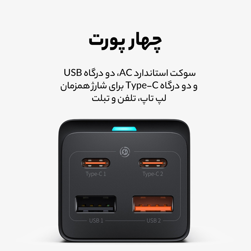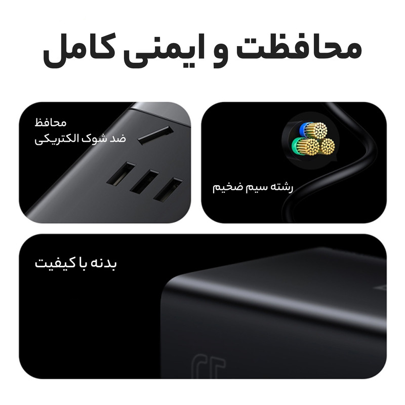 کمپانی بیسوس این محصول را در دو رنگ مختلف تولید کرده است. رنگ مشکی با کد PSZM000001 و رنگ سفید با کد PSZM000002 نشان داده می شود. این روزها که استفاده از تکنولوژی به یکی از مهمترین نیازهای بشر تبدیل شده است، لوازمهای برقی جایگاه ویژهای در زندگی همه پیدا کردهاند و پر بودن باتری آنها به یک دغدغه تبدیل شده است؛ خصوصا هنگامی که باتری آنها به صورت همزمان نیاز به دریافت انرژی داشته باشند. در چنین شرایطی نیاز به شارژری داریم که پاسخگوی تامین انرژی چند دستگاه به صورت همزمان باشد. به همین منظور کمپانی فعال بیسوس در عرصه تولید انواع شارژرهای فست، آداپتوری را طراحی کرده که با داشتن چهار پورت قادر به شارژ همزمان چهار دستگاه است. در ضمن از فناوری AC و DC به صورت همزمان بهرهمند است و شما میتوانید با توجه به این ویژگی نیروی برق یک دستگاه دیگر را هم تامین کنید. آداپتور PSZM000001 بسیار کارآمدتر از یک شارژ استاندارد است و با توجه به جسه کوچک و ابعاد 95x41x38 میلیمتری که دارد از توان 65 وات برخوردار بوده و قادر به شارژ دستگاه شما در کوتاهترین زمان ممکن است. وزنی معادل 341 گرم داشته و به راحتی قابل حمل است. شارژر فست شارژ بیسوس قابل استفاده برای انواع برندها بوده و قادر به شارژ کامل باتری مکبوک پرو 16 اینچ 2019 در مدت 2 ساعت و بیست دقیقه، آیفون 12 حدود 2 ساعت و میت 40 پرو در مدت کوتاه 55 دقیقه است. در طراحی این شارژر دیواری بیسوس از فناوری گالیوم نیترید استفاده شده که دارای ویژگیهای پهنای باند بالا، رسانایی گرمایی زیاد، مقاومت گرمایی قابل توجه، مقاومت تابشی، مقاومت در برابر اسید و قدرت و استحکام بالا است.