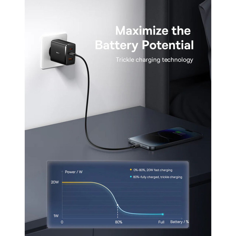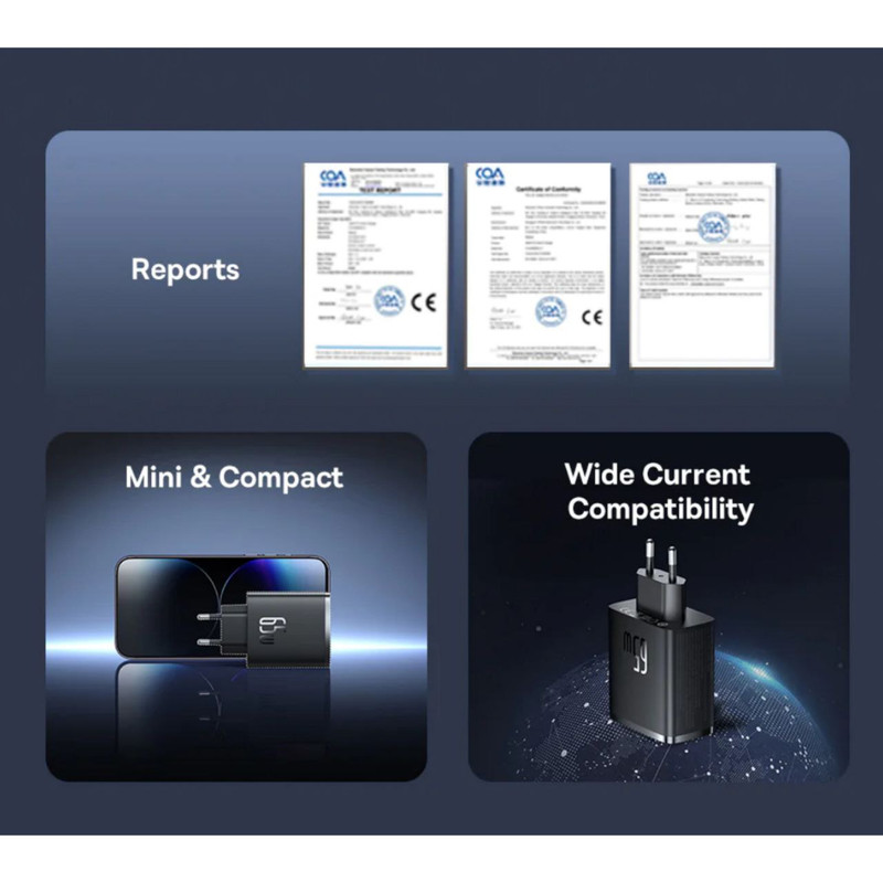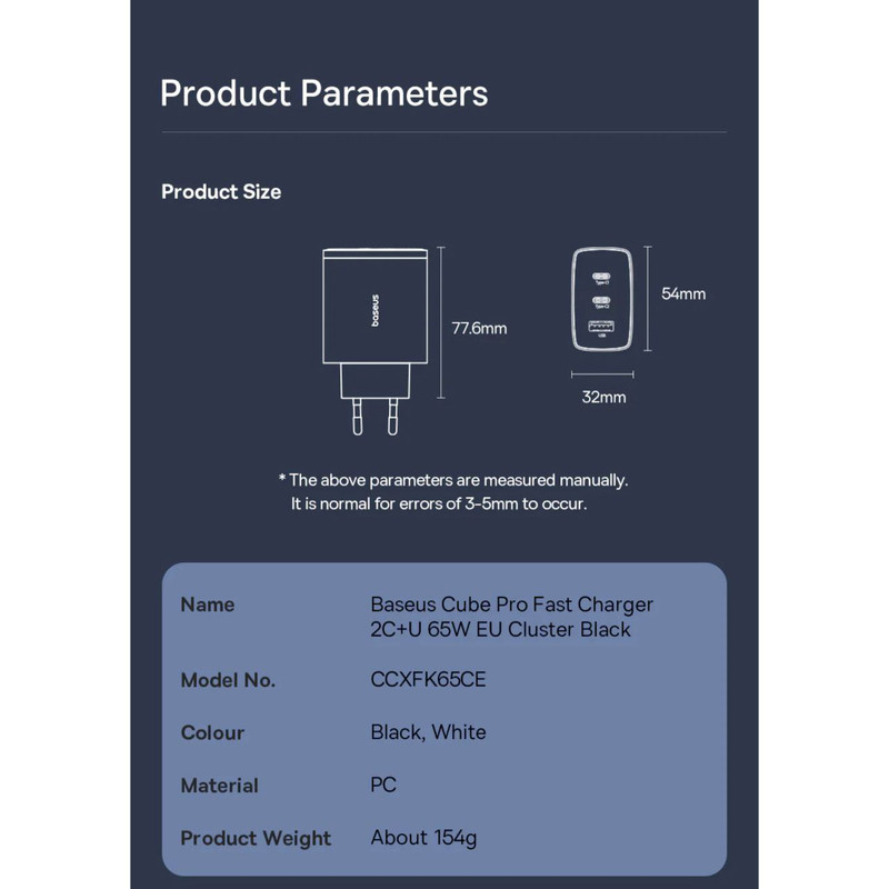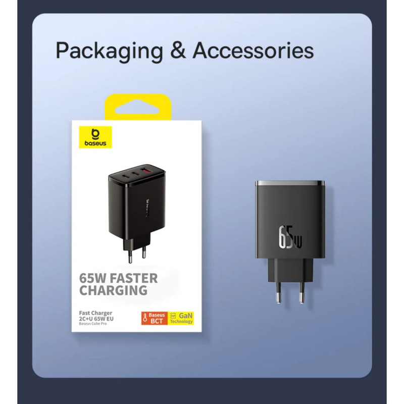 آیا نیاز به شارژ دستگاه های بیشتری دارید؟ نیازی به استفاده از شارژرهای اضافی یا صبر کردن برای آماده شدن یک قطعه از تجهیزات قبل از وصل کردن دستگاه دیگر نیست! شارژٰ BASEUS Cube Pro 3 مدل CCXFK65CE سه پورت ارائه می دهد ، بنابراین می توانید برای مثال، 2 گوشی هوشمند و یک کنسول بازی دستی را متصل کنید. علاوه بر این، شارژر به شما امکان میدهد همزمان 2 دستگاه را به سرعت شارژ کنید – با Baseus در زمان صرفهجویی خواهید کرد! شارژر Baseus OS-Cube Pro نه تنها در مورد عملکرد، بلکه در مورد ایمنی نیز است. فناوری پیشرفته BCT دما را کنترل می کند، بنابراین لازم نیست نگران داغ شدن بیش از حد محصول باشید. همچنین سیستم BPS2.0 قابل توجه است که وظیفه تنظیم هوشمند پارامترهای جریان را بر عهده دارد و آنها را با نیازهای دستگاه های متصل تطبیق می دهد. شارژر همچنین در برابر اضافه ولتاژ، اتصال کوتاه و جریان اضافی از جمله موارد دیگر محافظت می شود. علاوه بر این، فناوری شارژ Trickle از باتری دستگاه های متصل در برابر آسیب محافظت می کند. تکنولوژی GaN5: آخرین فناوری GaN5 نه تنها بهره وری انرژی را افزایش می دهد، بلکه باعث می شود شارژر در دمای پایین تری کار کند. این به معنای عمر طولانی تر دستگاه و شارژ ایمن برای دستگاه های شما است. کنترل دمای BCT: فناوری کنترل دمای Baseus BCT از فناوری نانو برای تسریع اتلاف گرما استفاده می کند و عملکرد پایدار و موثر شارژر را حتی در هنگام استفاده شدید تضمین می کند. تنظیم قدرت شارژ: سیستم توزیع برق Baseus BPS به طور خودکار توان و ولتاژ خروجی را تنظیم می کند که شارژ بهینه هر دستگاه متصل را تضمین می کند: از لپ تاپ گرفته تا تلفن های هوشمند و تبلت. شارژ سریع: به لطف پشتیبانی از پروتکل های شارژ سریع (Power Delivery 3.0، Quick Charge 3.0، PPS، SCP، FCP یا AFC)، این شارژر شارژ فوری و موثر را تضمین می کند و به شما امکان می دهد در مدت زمان کوتاهی از دستگاه های کاملاً شارژ شده لذت ببرید. ایمنی حرف اول را می زند: حفاظت های داخلی، از جمله اضافه ولتاژ، اضافه بار و کمبود ولتاژ، ایمنی دستگاه های الکترونیکی شما را در طول هر چرخه شارژ تضمین می کند. لازم نیست نگران گرمای بیش از حد یا رعد و برق باشید.