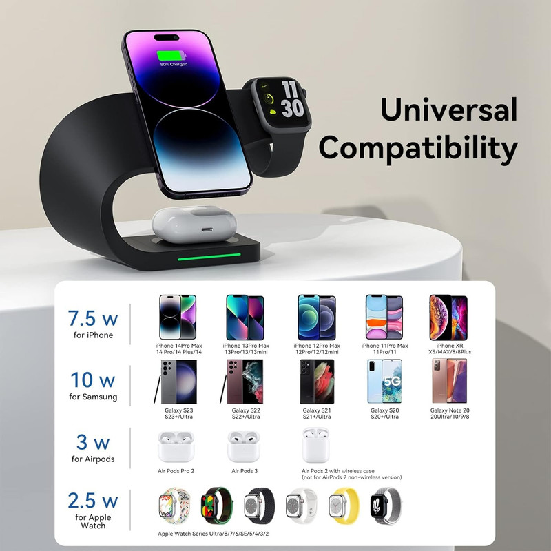 شارژر بی سیم 4 در 1 ما راه حل نهایی شارژ برای دستگاه های شما است. این شارژر با داشتن چندین محافظ ایمن و کارآمد، ایمنی دستگاه شما را تضمین می کند و در عین حال شارژ سریع و مطمئن را ارائه می دهد. با کمک شارژر بی سیم می توانید به راحتی گوشی، گوشی و ساعت خود را همزمان شارژ کنید. طراحی 4 در 1 به شما این امکان را می دهد که دستگاه های خود را در هر زمان و هر مکان شارژ کنید. این شارژر که با مواد باکیفیت ساخته شده است، دارای یک هسته مس خالص با جذب مغناطیسی فوق العاده قوی است که گوشی شما را چه به صورت افقی و چه عمودی در جای خود ایمن نگه می دارد. ظاهر نفیس و منحصر به فرد آن، در کنار طراحی ساده و یک تکه آن، حسی مدرن و شیک به هر فضایی می بخشد. صفحه نمایش چراغ نشانگر LED اطلاعاتی را در زمان واقعی از وضعیت کار شارژر ارائه می دهد. نور آبی نشان می دهد که دستگاه شما در حال شارژ شدن است. با این قابلیت می توانید به راحتی روند شارژ خود را زیر نظر داشته باشید. این شارژر نه تنها عملکردهای متعددی را ارائه می دهد، بلکه به عنوان پایه مناسب تلفن همراه نیز عمل می کند. طراحی ارگونومیک آن اجازه می دهد تا زوایای دید راحت در هنگام تماشای فیلم یا برقراری تماس ویدیویی را داشته باشید. با خطوط داده نامرتب خداحافظی کنید زیرا این شارژر درهم ریختگی را از بین می برد و کمترین فضا را اشغال می کند. مدل های قابل اجرا: برای تلفن با عملکرد شارژ بی سیم، برای اپل واچ 2/3/4/5/6/7/SE، برای ایرپاد 2/3/Pro برای پایداری بیشتر در هنگام شارژ تلفت همراه یا باید قاب گوشی را خارج کنید یا از برچسب مگنتی داخل جعبه بر روی گوشی زیر قاب استفاده کنید. لطفاً هیچ آهنربا یا کارتی را در قاب گوشی یا نزدیک شارژر قرار ندهید. جریان ورودی: 9V/4A خروجی شارژ بی سیم تلفن: حداکثر 5W/7.5W/10W/15W خروجی هدفون: حداکثر 3 وات خروجی ساعت: حداکثر 2 وات توان کل: 28 وات