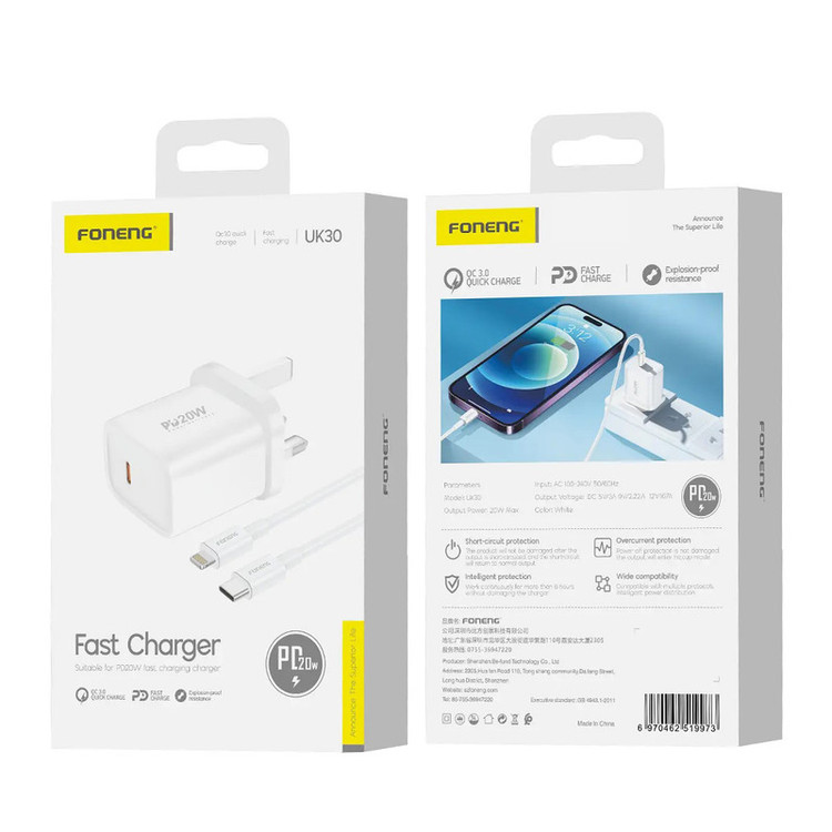 شارژر دیواری 20 وات فوننگ مدل UK30 به همراه کابل لایتنینگ