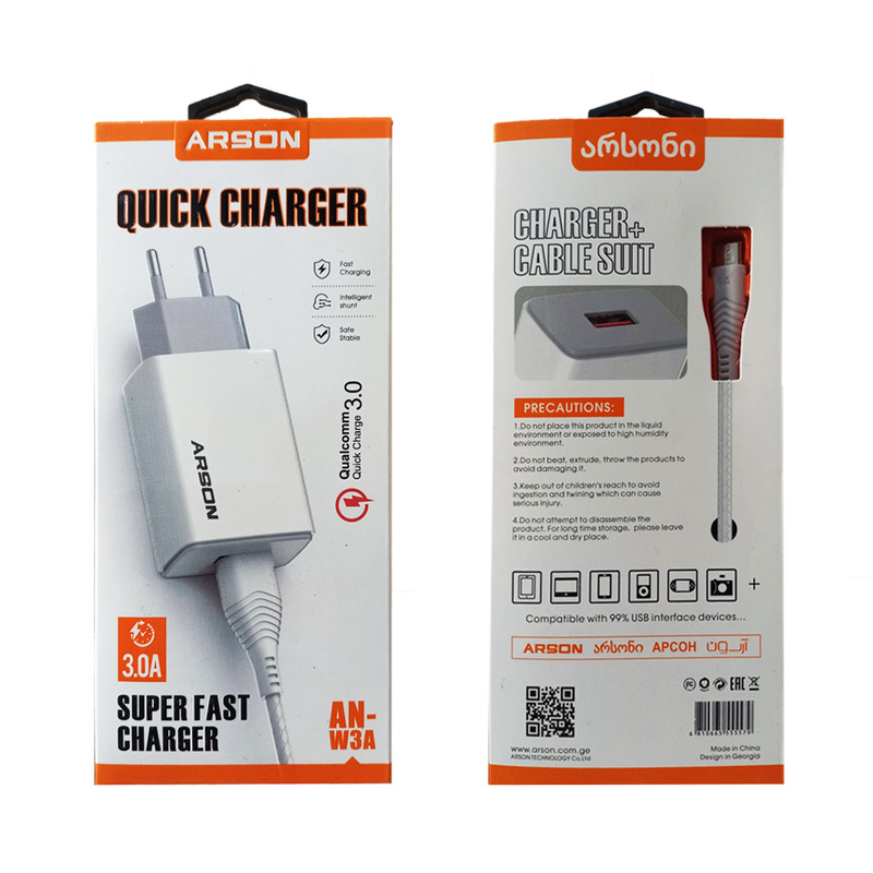 شارژر دیواری سوپر فست شارژ آرسون (ARSON) مدل AN-W3A با داشتن 1 درگاه خروجی از نوع USB 3.0 و مجهز بودن به تکنولوژی Quick Charge 3.0 و دارا بودن یک کابل تایپ سی (TYPE-C) بسیار باکیفیت، قادر است انواع گوشیهای موبایل، تبلت، دوربینهای دیجیتال و دیگر لوازم مجهز به درگاه Type-C را با سرعت بسیار بالا شارژ نماید. ولتاژ ورودی در این شارژر، 100-240 ولت و شدت جریان و ولتاژ خروجی، 5V/3A, 9V/2.5A, 12V/2A می باشد. بدنه این محصول پلاستیکی بوده و از کیفیت ساخت قابل قبولی هم برخوردار است. شارژر دیواری AN-W3A، با داشتن قابلیت محافظت در برابر اتصال کوتاه و افزایش ولتاژ، شارژ مطلوبی را بدون آنکه به دستگاه شما آسیب برساند، ارائه می کند.