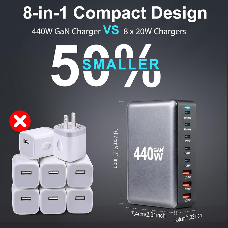 شارژر 440 وات YMX440 یک شارژر فوقالعاده قدرتمند و پیشرفته است که برای پاسخگویی به نیازهای شارژ کاربران حرفهای و افرادی که چندین دستگاه را بهصورت همزمان استفاده میکنند، طراحی شده است. این شارژر با بهرهمندی از فناوری گالیوم نیترید (GaN) نسل سوم، توان بالا را در ابعادی کوچک و با کارایی بهینه ارائه میدهد. بدنهی فلزی و مستحکم این محصول با طراحی مدرن و مینیمال، نهتنها دوام بالایی دارد، بلکه جلوهای زیبا به فضای کاری یا خانگی شما میبخشد. این شارژر مجهز به مجموعهای از پورتهای متنوع است که شامل پنج پورت USB-C و سه پورت USB-A میشود. پورتهای USB-C با توانهای 100 وات و 65 وات، امکان شارژ سریع دستگاههای پرمصرف مانند لپتاپها، مکبوکها و تبلتها را فراهم میکنند. همچنین، پورتهای USB-A با توان 18 وات و پشتیبانی از فناوری Quick Charge (QC) برای شارژ سریع گوشیهای هوشمند و سایر دستگاههای سازگار طراحی شدهاند. این تنوع در پورتها، شارژر را به گزینهای ایدهآل برای شارژ همزمان چندین دستگاه تبدیل کرده است. شارژر 440 وات YMX440 از پروتکلهای شارژ سریع مانند Power Delivery (PD) و Quick Charge پشتیبانی میکند و با سیستم محافظت چندلایه، ایمنی کامل دستگاههای متصل را تضمین میکند. این سیستم شامل تکنولوژی محافظت در برابر جریان بیشازحد، ولتاژ بالا و افزایش دما است. طراحی پایهی نگهدارندهی این شارژر، استفادهی آسان و قرارگیری مرتب روی سطوح مختلف را ممکن میسازد. با توان کلی 440 وات، این شارژر انتخابی بینظیر برای افرادی است که به دنبال یک راهحل شارژ قدرتمند، ایمن و همهکاره هستند.