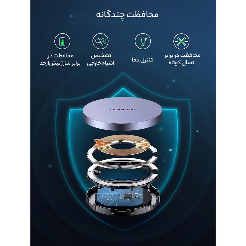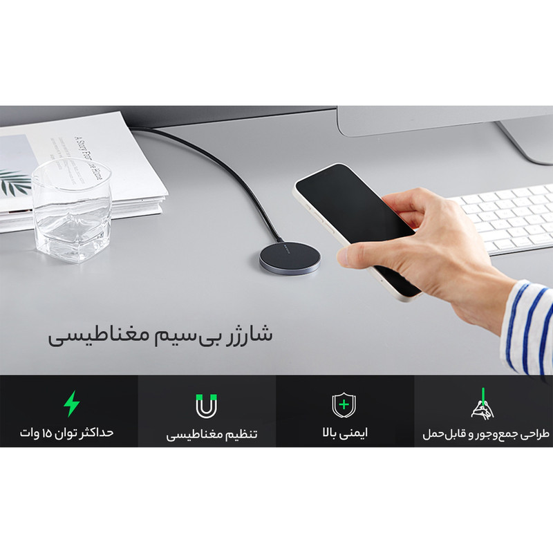 شارژر بیسیم MagSafe برای آیفون: با گواهینامهی Qi، این شارژر بیسیم مغناطیسی MagSafe پشتیبانی از شارژ سریع 7.5 وات برای آیفون 14/14 Pro/14 Pro Max/13 Pro Max/13 Pro/13/12 Pro Max/12 Pro/12/Mini 12 و غیره و 5 وات شارژ سریع برای AirPods/AirPods Pro و غیره را دارد. فقط دستگاه خود را روی پد شارژ قرار دهید، شارژر بیسیم با سرعتی 3 برابر سریعتر از شارژرهای بیسیم سنتی شارژ میشود. راحتی در شارژ: فقط دستگاه مجهز به Qi با مغناطیس را در مرکز پد شارژ بیسیم قرار دهید، و تلفن شما فوراً به صورت مغناطیسی جذب و شارژ میشود. این برای شما راحتتر است تا با تلفن خود بازی کنید و آن را شارژ کنید. شارژ امنتر: با یک سیستم چندگانه محافظت، این شارژر بیسیم MagSafe آیفون به شما و دستگاههایتان محافظت از شارژ بیشازحد، تشخیص بیگانه، کنترل دما و محافظت از مدار کوتاه را فراهم میکند. شارژر بیسیم مغناطیسی MagSafe: سیم شارژ قوی مغناطیسی میتواند شما را در شارژ آیفون با یک قاب تلفن مغناطیسی نگه دارد. شیک و نازک: با طراحی 6.2 میلیمتر ضخامت و وزن 62 گرم، این شارژر بیسیم MagSafe از UGREEN مناسب برای تقریباً تمام کیفهاست، برای شما راحتتر است تا آن را هر جا ببرید. ساخته شده از آلومینیوم، پوسته بهتر حرارت را پخش میکند، تجربه شارژ پایدارتری برای شما فراهم میکند. کابل USB C 1.5 متری داخلی که به شما امکان میدهد با یک شارژر PD، دستگاه را سریعتر شارژ کنید.
