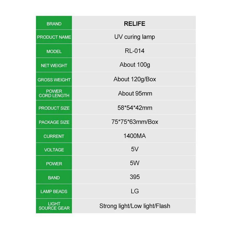 این محصول لامپ ماوراء بنفش 5 وات ریلایف مدل RL-014 یو وی با توان خروجی کلی 5 وات است و دارای کابل متصل به طول 9٫5 سانتی متر با رابط USB جهت اتصال به آداپتور و تامین انرژی می باشد. این لامپ UV مجهز به یک عدد کلید فیزیکی به منظور روشن و خاموش کردن و تغییر حالت نوردهی است. محصول فوق، ابزاری کاربردی جهت تعمیرات گوشی موبایل و برد، خشک کردن چسب UV، عایق برد و ... می باشد. در ساخت این محصول از متریال پلاستیک، آلیاژ آلومینیوم و سیلیکون استفاده شده است. جریان کاری این ابزار 1400 میلی آمپر و ولتاژ کاری آن 5 ولت است.