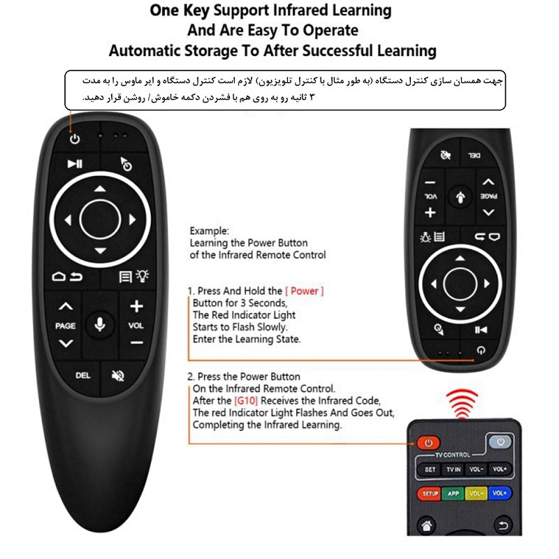 ریموت کنترل Air Mouse مدل G10s Pro، ژیروسکوپ دار، دارای قابلیت دریافت فرمان صوتی با تلویزیونهای هوشمند اندرویدی (مانند تلویزیون الجی) و همچنین انواع تی وی باکس های خانگی سازگاری دارد و از این رو میتواند کاربردهای بسیاری داشته باشد. این ریموت از طریق یک دانگل USB و به صورت بیسیم به دستگاه مورد نظر متصل میشود و با سیستم عامل اندروید سازگاری دارد. این مدل از طریق دو عدد باتری نیمقلمی تغذیه میشود. این ریموت دارای ژیروسکوپ هست بدین ترتیب که شما می توانید با تنها با تکان دادن کنترل نشانگر را به حرکت درآورید. برد بیسیم آن هم کمتر از ۱۰ متر است که در شرایط مختلف میتواند پاسخگوی نیازهای کاربر باشد. میکروفون تعبیه شده در این کنترل می تواند فرمان صوتی شما را اجرا کند. از دیگر مزیت های این کیبورد، وجود چراغ زیر کلیدهای ریموت است که در هنگام کار کردن در شب پاسخگوی نیاز کاربر است. راهنمای استفاده از ریموت ایر ماوس G10s Pro برای تلویزیون: تلویزیون خود را خاموش کنید. دانگل ریموت ایر ماوس را به تلویزیون خود متصل کنید. باتری ها را در محل خود قرار دهید. بگذارید چراغ چشمک زن قرمز رنگ ریموت ایر ماوس خاموش شود. بعد از 30 ثانیه ابتدا تلویزیون را روشن کنید سپس کلید نشانگر ماوس روی ریموت را بفشارید. اکنون نشانگر ماوس را روی تلویزیون خود مشاهده می کنید و می توانید از آن به راحتی استفاده کنید. جهت همسان سازی کنترل دستگاه (به طور مثال با تلویزیون) لازم است کنترل دستگاه و ایر ماوس را به مدت 3 ثانیه رو به روی هم با فشردن دکمه خاموش/ روشن قرار دهید. جهت استفاده از ایر ماوس G10s Pro بر روی دستگاه های دیگر لازم است باتری ها را یک بار خارج، و مجددا در محل خود قرار دهید. این عمل باعث رفرش شدن کنترل می گردد. دستورالعمل فوق جهت اجرا روی دستگاه ها دیگر مانند: اندروید باکس، لپ تاپ و .. قابل انجام است. دقت کنید این ریموت تنها با تلویزیون های هوشمند سازگار است (برای اطمینان از هوشمند بودن تلویزیون خود کافیست ماوس کامپیوتر خود را به تلویزیون متصل نمایید اگر نشانگر ماوس را ملاحظه نمودید، تلویزیون شما هوشمند است) و نه تلویزیون هایی که دارای درگاه یو اس بی هستند و یا تلویزیون هایی که قابلیت اتصال به اینترنت را دارند.