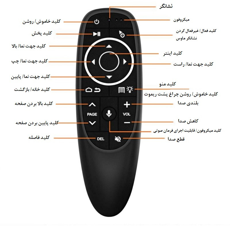 ریموت کنترل Air Mouse مدل G10s Pro، ژیروسکوپ دار، دارای قابلیت دریافت فرمان صوتی با تلویزیونهای هوشمند اندرویدی (مانند تلویزیون الجی) و همچنین انواع تی وی باکس های خانگی سازگاری دارد و از این رو میتواند کاربردهای بسیاری داشته باشد. این ریموت از طریق یک دانگل USB و به صورت بیسیم به دستگاه مورد نظر متصل میشود و با سیستم عامل اندروید سازگاری دارد. این مدل از طریق دو عدد باتری نیمقلمی تغذیه میشود. این ریموت دارای ژیروسکوپ هست بدین ترتیب که شما می توانید با تنها با تکان دادن کنترل نشانگر را به حرکت درآورید. برد بیسیم آن هم کمتر از ۱۰ متر است که در شرایط مختلف میتواند پاسخگوی نیازهای کاربر باشد. میکروفون تعبیه شده در این کنترل می تواند فرمان صوتی شما را اجرا کند. از دیگر مزیت های این کیبورد، وجود چراغ زیر کلیدهای ریموت است که در هنگام کار کردن در شب پاسخگوی نیاز کاربر است. راهنمای استفاده از ریموت ایر ماوس G10s Pro برای تلویزیون: تلویزیون خود را خاموش کنید. دانگل ریموت ایر ماوس را به تلویزیون خود متصل کنید. باتری ها را در محل خود قرار دهید. بگذارید چراغ چشمک زن قرمز رنگ ریموت ایر ماوس خاموش شود. بعد از 30 ثانیه ابتدا تلویزیون را روشن کنید سپس کلید نشانگر ماوس روی ریموت را بفشارید. اکنون نشانگر ماوس را روی تلویزیون خود مشاهده می کنید و می توانید از آن به راحتی استفاده کنید. جهت همسان سازی کنترل دستگاه (به طور مثال با تلویزیون) لازم است کنترل دستگاه و ایر ماوس را به مدت 3 ثانیه رو به روی هم با فشردن دکمه خاموش/ روشن قرار دهید. جهت استفاده از ایر ماوس G10s Pro بر روی دستگاه های دیگر لازم است باتری ها را یک بار خارج، و مجددا در محل خود قرار دهید. این عمل باعث رفرش شدن کنترل می گردد. دستورالعمل فوق جهت اجرا روی دستگاه ها دیگر مانند: اندروید باکس، لپ تاپ و .. قابل انجام است. دقت کنید این ریموت تنها با تلویزیون های هوشمند سازگار است (برای اطمینان از هوشمند بودن تلویزیون خود کافیست ماوس کامپیوتر خود را به تلویزیون متصل نمایید اگر نشانگر ماوس را ملاحظه نمودید، تلویزیون شما هوشمند است) و نه تلویزیون هایی که دارای درگاه یو اس بی هستند و یا تلویزیون هایی که قابلیت اتصال به اینترنت را دارند.