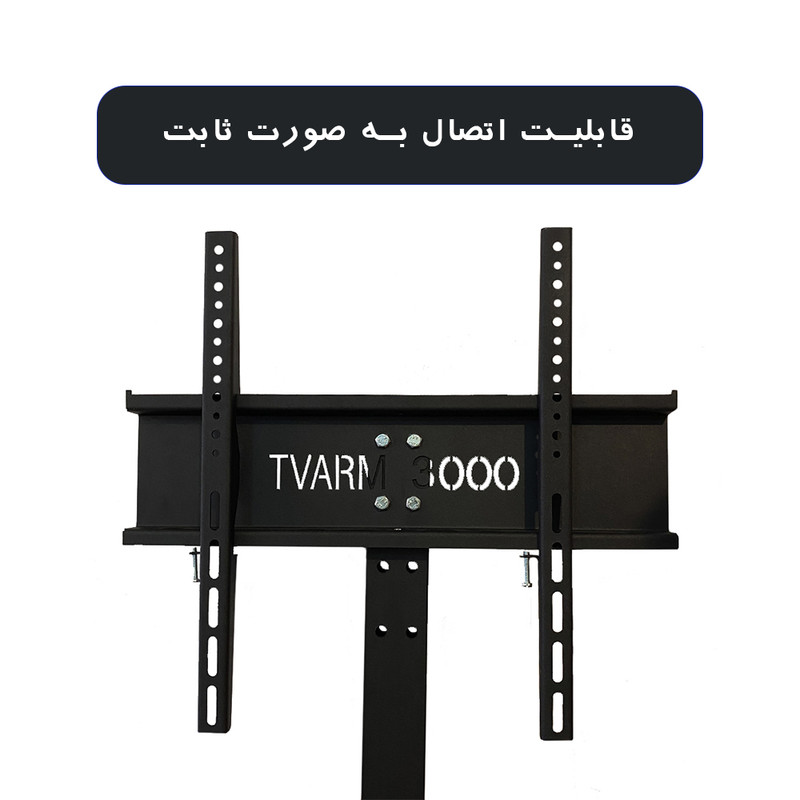 پایه رومیزی تی وی آرم 3000 مناسب افرادی میباشد که تمایل به قرار دادن تلویزیون خود روی میز تلویزیون را دارند ولی پایه TV خود را به هر نحوی از دست داده اند ، این پایه طوری طراحی و ساخته شده است که به تمامی تلویزیون ها با برند ها و ابعاد مختلف ( استاندارد VESA از جای پیچ 10 در 10 تا 40 در 40 ) سازگاری دارد . سهولت در نصب و زیبایی در عین حال کاربردی بودن این کالا از ویژگی های آن می باشد . در ضمن تفاوت این پایه با مدل 2000 در جابه جایی جهت چپ و راست سینی پشت تلویزیون میباشد .