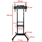 استند نمایشگاهی تلویزیون تی وی جک Tv jack مدل X۵۰ می باشد مناسب همه برند تلویزیون پایه ایستاده تلویزیون دارای کارایی بالا و جامع جهت قرار دادن انواع تلویزیون ها (OLED – LED – LCD- پلاسما- مانیتور تاچ اسکرین یا مانیتور لمسی- مانیتور صنعتی و… ) از تمامی برندها می باشد. مناسب برای دانشگاه ها، فرودگاه ها، اتاق های کنفرانس ادارات، سالن های همایش ها، مراکز نمایشگاهی، ورودی شرکت های بزرگ، سالن ها و در مکان هایی که نیاز به جابجایی تلویزیون میباشد است. از مزایا پایه ایستاده تلویزیون (ترولی) تی وی جک مدل X۵۰ پایه متحرک زمینی دارای چهار چرخ و همچنین دارای دو طبقه شیشه ای (شیشه ای با ضخامت ۶MM ) برای قرار دادن DVD Player و دستگاه گیرنده دیجیتال،دستگاه بازی می باشد. و چرخ های تعبیه شده در این محصول قابلیت جابجایی بسیار آسان تلویزیون نصب شده بر روی این استند را به کاربران میدهد.بطوریکه با وجود وزن بسیار سبک خود پایه و قدرت حرکتی بالا بدلیل وجود همین ۴ چرخ، بازهم این پایه دارای ایستایی و قدرت بالایی است و بدلیل اینکه طراحی و تولید این محصول بر اساس استاندارد بین المللی VESA صورت گرفته است، توانایی و قدرت ساپورت تلویزیون هایی با ابعاد (۳۲ تا ۷۵ اینچ ) و سنگینتر (تا ۳۰ کیلوگرم ) را به این پایه میدهد. از مزیت های مهم این پایه ایستاده ی چرخ دار، قابلیت تنظیم ارتفاع پایه (تلویزیون و همچنین بدنه نگهدارنده ) میباشد. وجود بازوهای بسیار قوی در قسمت مربوط به نصب تلویزیون و جنس بدنه و پلیت و بازوها با آهن ۲MM با کیفیت بالا و رنگ استاتیک مشکی ، ضد گرد و غبار و مناسب با تمام شرایط آب و هوایی است . همانطور که در عکس های این استند مشاهده میکند ابعاد کامل این پایه ایستاده کاملا واضح نشان داده است.