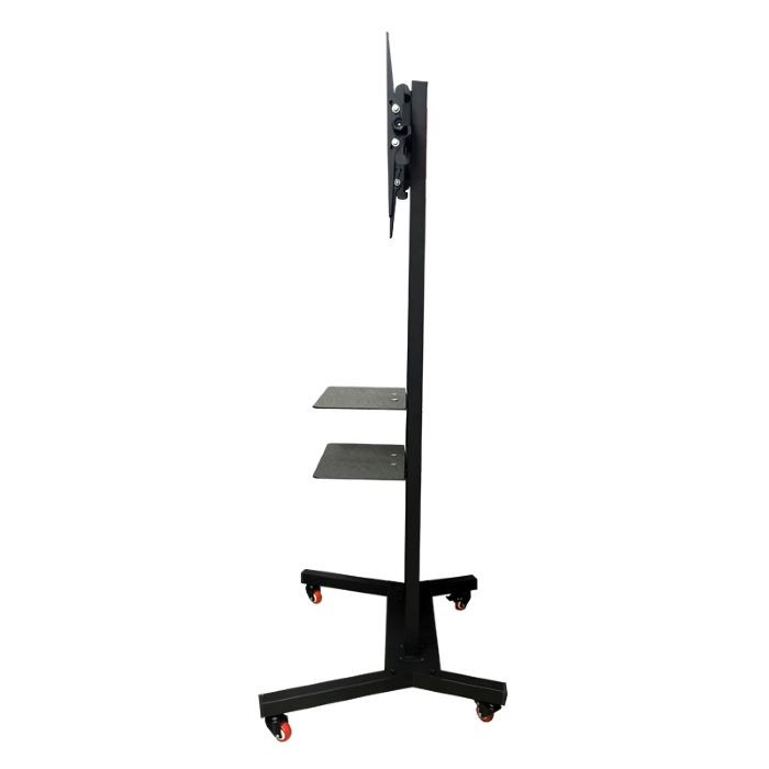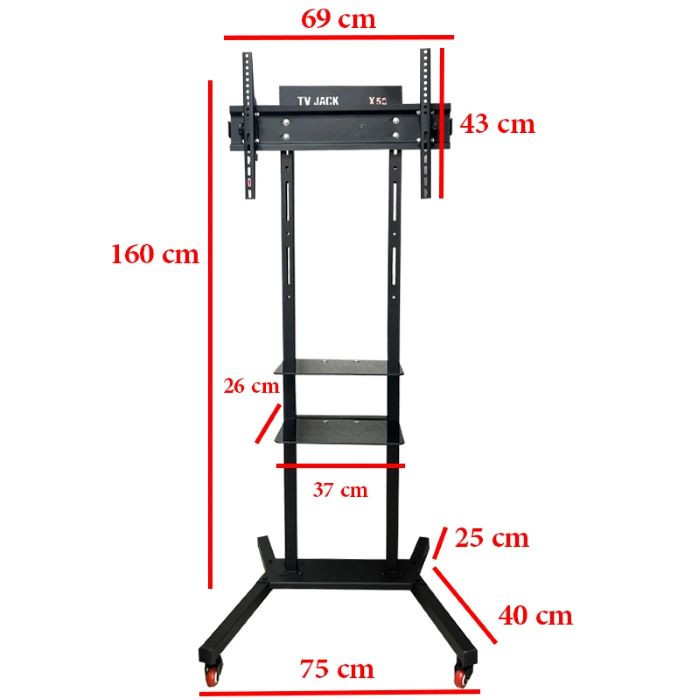 استند نمایشگاهی تلویزیون تی وی جک Tv jack مدل X۵۰ می باشد مناسب همه برند تلویزیون پایه ایستاده تلویزیون دارای کارایی بالا و جامع جهت قرار دادن انواع تلویزیون ها (OLED – LED – LCD- پلاسما- مانیتور تاچ اسکرین یا مانیتور لمسی- مانیتور صنعتی و… ) از تمامی برندها می باشد. مناسب برای دانشگاه ها، فرودگاه ها، اتاق های کنفرانس ادارات، سالن های همایش ها، مراکز نمایشگاهی، ورودی شرکت های بزرگ، سالن ها و در مکان هایی که نیاز به جابجایی تلویزیون میباشد است. از مزایا پایه ایستاده تلویزیون (ترولی) تی وی جک مدل X۵۰ پایه متحرک زمینی دارای چهار چرخ و همچنین دارای دو طبقه شیشه ای (شیشه ای با ضخامت ۶MM ) برای قرار دادن DVD Player و دستگاه گیرنده دیجیتال،دستگاه بازی می باشد. و چرخ های تعبیه شده در این محصول قابلیت جابجایی بسیار آسان تلویزیون نصب شده بر روی این استند را به کاربران میدهد.بطوریکه با وجود وزن بسیار سبک خود پایه و قدرت حرکتی بالا بدلیل وجود همین ۴ چرخ، بازهم این پایه دارای ایستایی و قدرت بالایی است و بدلیل اینکه طراحی و تولید این محصول بر اساس استاندارد بین المللی VESA صورت گرفته است، توانایی و قدرت ساپورت تلویزیون هایی با ابعاد (۳۲ تا ۷۵ اینچ ) و سنگینتر (تا ۳۰ کیلوگرم ) را به این پایه میدهد. از مزیت های مهم این پایه ایستاده ی چرخ دار، قابلیت تنظیم ارتفاع پایه (تلویزیون و همچنین بدنه نگهدارنده ) میباشد. وجود بازوهای بسیار قوی در قسمت مربوط به نصب تلویزیون و جنس بدنه و پلیت و بازوها با آهن ۲MM با کیفیت بالا و رنگ استاتیک مشکی ، ضد گرد و غبار و مناسب با تمام شرایط آب و هوایی است . همانطور که در عکس های این استند مشاهده میکند ابعاد کامل این پایه ایستاده کاملا واضح نشان داده است.
