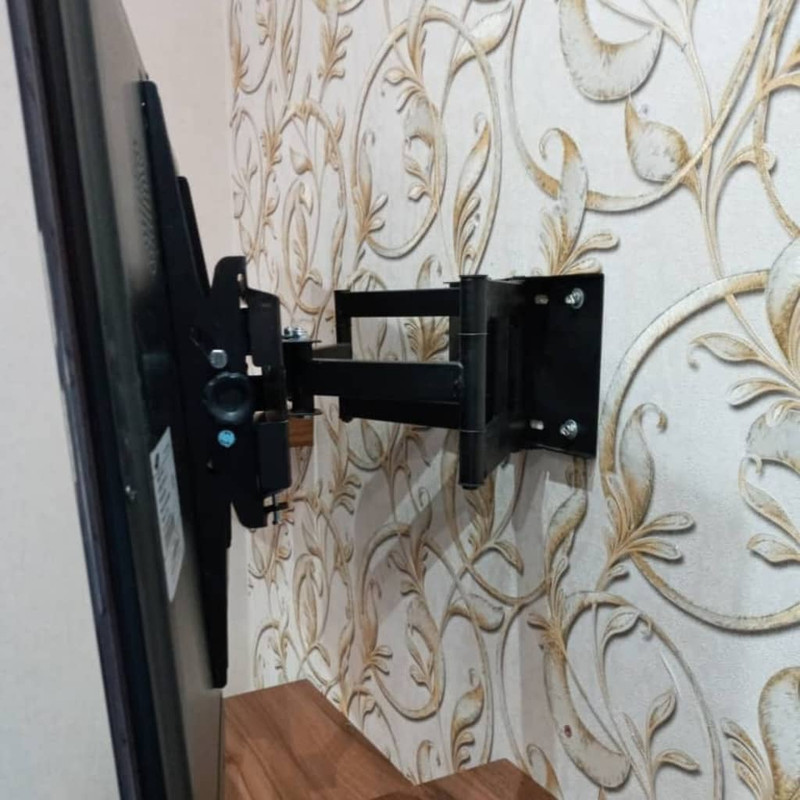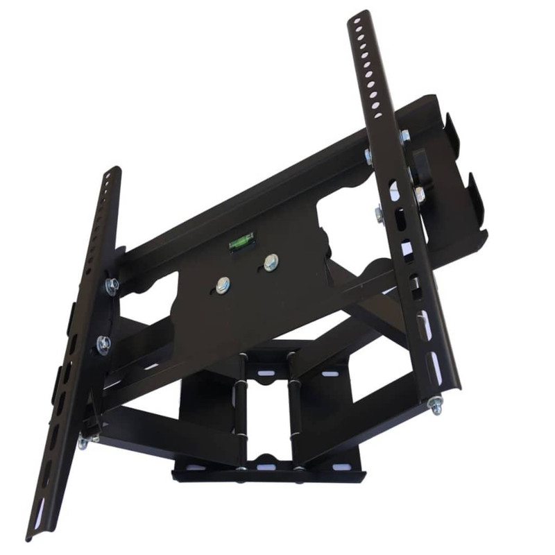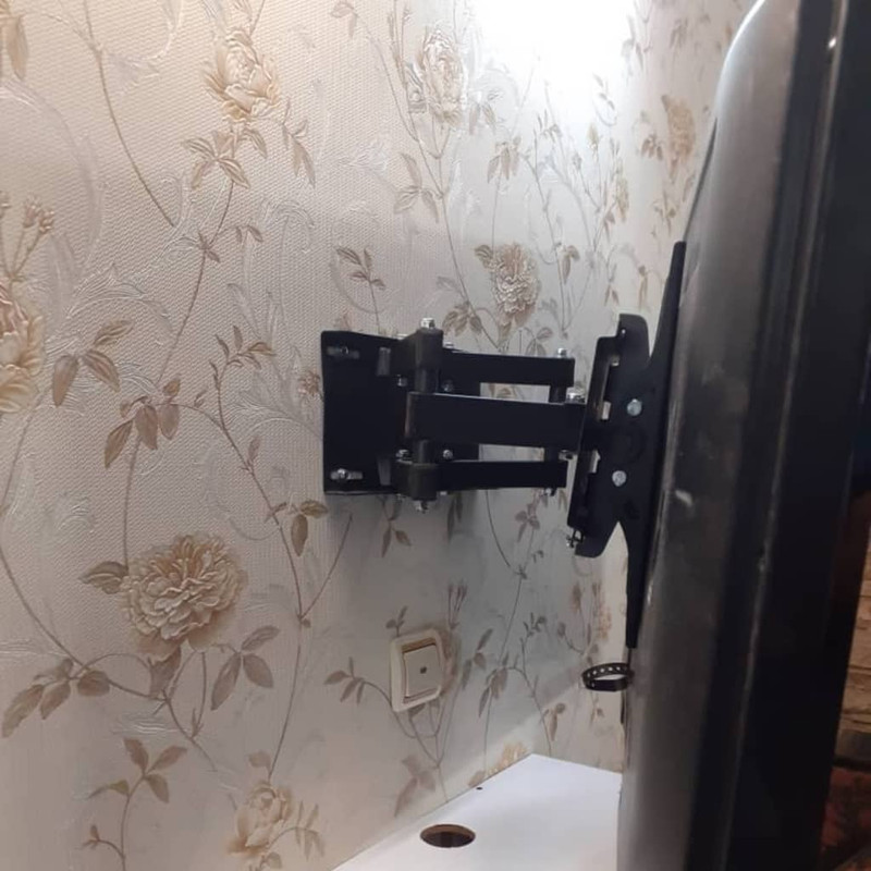 این پایه دیواری تلویزیون به براکت چرخشی، دوبازویی بزرگ یا متحرک در شش جهت (جلو و عقب، چپ و راست، رو به بالا و پایین تنظیم شو با زاویه شیب حدود 15 الی 25 درجه) معروف میباشد و برای تلویزیونهای 43 تا 65 اینچ طراحی شده است. در حال حاضر براکت های زیادی وجود دارند ولی این براکت از لحاظ استحکام (تهیه شده از ورق فولاد قوی)، ضریب ایمنی بالا و اطمینان در دیواری نمودن تلویزیون ارزشمند شما مورد تایید آسیا چوب میباشد. در ضمن کلیه وسایل مورد نیاز برای نصب روی دیوار در بسته بندی موجود میباشد. راهنمای نصب: ابتدا دو شاخک را به پشت تلویزیون متصل نموده و بعد از نصب دو فلکه مشکی مطابق عکس به شاخکها، تلویزیون را بر روی بازویی که به دیوار با مته شماره 8 پیچ و رولپلاک شده قرار میدهید. سپس دو پیچ پایین شاخکها را به سمت پشت برآمدگی سینی محکم نمایید.