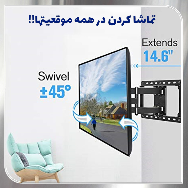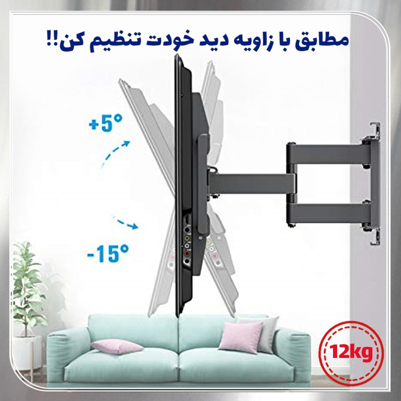 وزن 1850 گرم قابلیت تحرک و چرخش 15 درجه به دو جهت بالا و پایین جنس فولاد طول سینی 50 طول شاخک 42 پشتیبانی از تمامی تلویزیونهای 40 تا 60 اینچ که فاصله سوراخهای پشت آنها تا40×40 و 30×30 و 20×20 سانتیمتر باشد ابعاد بسته بندی 56×15×6 سانتیمتر
