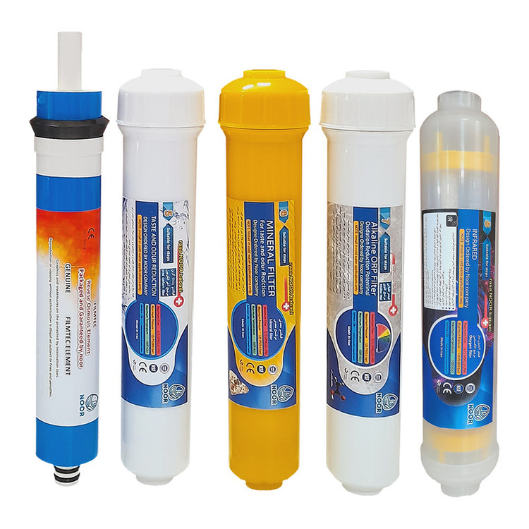 این پک 5 عددی فیلتر تصفیه آب خانگی در تمام دستگاه ها با انواع برندها قابل استفاده می باشد . این فیلترها بگونه ای طراحی شده است که میتوانید محتویات داخل فیلتر را مشاهده و حتی آزمایش نمایید. جنس بدنه آنها از پلی پرو پیلن گرید خوراکی Food Grade میباشد.داخل این پک از فیلتر ممبران film tec استفاده شده است که جهت حذف و کاهش سختی آب و انواع میکروب ها و باکتری ها و فلزات سنگین در آب استفاده می شود و کاهش 99% سختی آب را در پی دارد بنابراین پس از انجام این فرایند آب تصفیه شده در مخزن ذخیره میگردد ، حال جهت حذف بو و مزه احتمالی آب ناشی از ذخیره شدن آب در مخزن از فیلتر پست کربن در این پک استفاده میشود از طرفی داخل این پک فیلتر معدنی استفاده گردیده است که برای متعادلسازی سختی آب و بهبود طعم آب و افزودن املاح معدنی به آب از این فیلتر استفاده میگردد فیلتر بعدی داخل پک فیلتر قلیایی می باشد که وظیفه ی تبدیل آب اسیدی به قلیایی را بر عهده دارد که طی بررسی های صورت گرفته مشخص گردیده است که نوشیدن آب قلیایی خاصیت ضد سرطانی داشته و به بهبود گوارش و سیستم ایمنی بدن نیز کمک شایانی می کند و بعنوان اخرین فیلتر داخل این پک از فیلتر اکسیژن ساز برای انرژی زایی و تبدیل آب از H2O به HO2 استفاده شده است که وظیفه ی اکسیژن رسانی بیشتر به ارگان های بدن و شفافیت پوست و مو را در بر دارد .