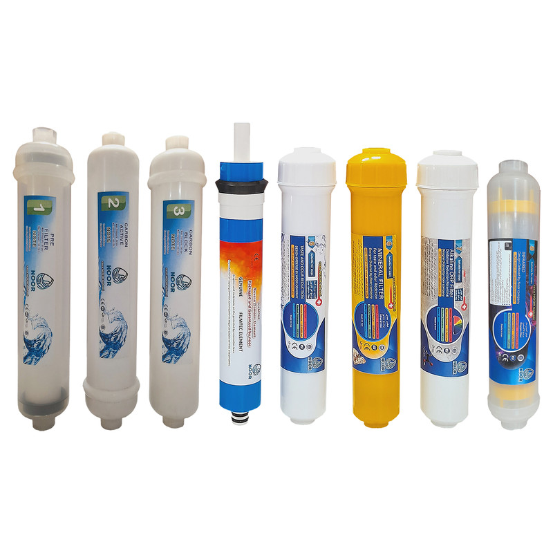 پک فیلتر خطی سری L800 و تمامی فیلترهای شرکت نور تماما از جنس پوست بادام و پسته بوده و دارای تاییدیههای بهداشتی از صنایع غذا و دارو میباشند. همچنین جنس بدنه فیلترها از نوع FOOD GRADE (گرید غذایی) بوده که این خود نشان از کیفیت بالای فیلترها میباشد. فیلترهای این شرکت به گونهای طراحی شدهاند که میتوانید محتویات داخل فیلترها را مشاهده و حتی آزمایش نمایید. این فیلترها در تمام دستگاههای تصفیه آب خانگی خطی (LINE , INLINE ) قابل استفاده میباشند. فیلترهای به کار رفته در این پک شامل: فیلتر الیافی P.P پنج میکرون جهت حذف شن ، ماسه ، زنگ آهن و....،فیلتر کربن اکتیو جهت حذف گازهای موجود در آب مانند کلر ، بنزن ، آمونیاک و... ، فیلتر P.P یک میکرون جهت حذف گازهای باقی مانده در آب و ذرات فعال از فیلتر مرحله دوم ، فیلتر ممبران با شیتهای FILM TEC جهت کاهش سختی آب و حذف انواع میکروب ها و باکتری ها و سپس قرار گیری فیلتر پست کربن داخل پک زیرا آب بعد از تصفیه کامل در مخزن ذخیره می گردد حال فیلتر پست کربن جهت حذف طعم و بوی نامطبوع آب استفاده می گردد سپس قرار گیری فیلتر مینرال برای افزودن املاح معدنی به آب مانند سدیم پتاسیم منیزیم کلسیم که جهت طعم دهی به آب داخل پک تعبیه شده است سپس فیلتر قلیایی یا آلکالاین در پک قرار داده شده تا آب را به آب قلیایی تبدیل نماید که ثابت شده است آب قلیایی خاصیت ضد سر طانی و ضد پیری داشته و برای شفافیت پوست و مو مناسب می باشد و در نهایت فیلتر اکسیژن ساز داخل پک قرار داده شده است که با تبدیل آب به آب اکسیژنه ( تبدیل H2O به HO2 )باعث افزایش تمرکز و افزایش سوخت و ساز بدن در فعالیت های ورزشی و افزایش انرژی می شود .