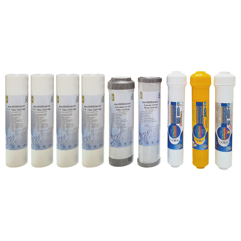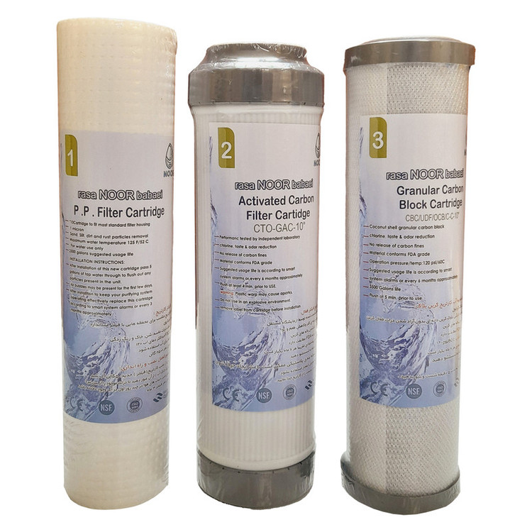 پک فیلتر تصفیه کننده آب ارگونومی پلاس شامل 4 عدد فیلتر شماره یک دستگاه تصفیه آب خانگی می باشد که شرکت تصفیه آب رسا نور بابایی برای بالا بردن کیفیت فیلترها و حذف مواد نامحلول از جمله شن ، ماسه ، زنگ آهن و ... اقدام به استفاده از فیلتر 1 میکرون 150 گرم در داخل پک نموده است که از طرفی این فیلتر به جهت تراکم بالا و قطر یک میکرون باعث بالا رفتن طول عمر قطعات شیر برقی و پمپ دستگاه می شود همچنین داخل این پک 1 عدد فیلتر کربن اکتیو و 1 عدد فیلتر کربن بلاک قرار داده شده است که وظیفه ی حذف انواع گازها از جمله کلر ، بنزن ، آمونیاک و.... را بر عهده دارد حال جهت حذف بو و مزه احتمالی آب ناشی از ذخیره شدن آب در مخزن از فیلتر پست کربن استفاده می گردد که در داخل پک تعبیه شده است و همینطور فیلتر مینرال یا معدنی داخل پک قرار داده شده است که وظیفه ی طعم دهندگی به آب و افزودن املاح معدنی از جمله سدیم پتاسیم منیزیم کلسیم و.... را بر عهده دارد و در اخر فیلتر قلیایی یا آلکالاین در پک تعبیه شده که آب تصفیه شده را به آب قلیایی تبدیل می کند که خاصیت ضد پیری و سرطانی داشته و باعث شفافیت پوست و مو شده و به بهبود عملکرد گوارشی بدن کمک می کند ، لازم به ذکر است فیلترهای شرکت رسا نور بابایی ( نور ) بگونه ای طراحی شده که قابل استفاده در تمام دستگاه های تصفیه آب خانگی با انواع برندها می باشد .