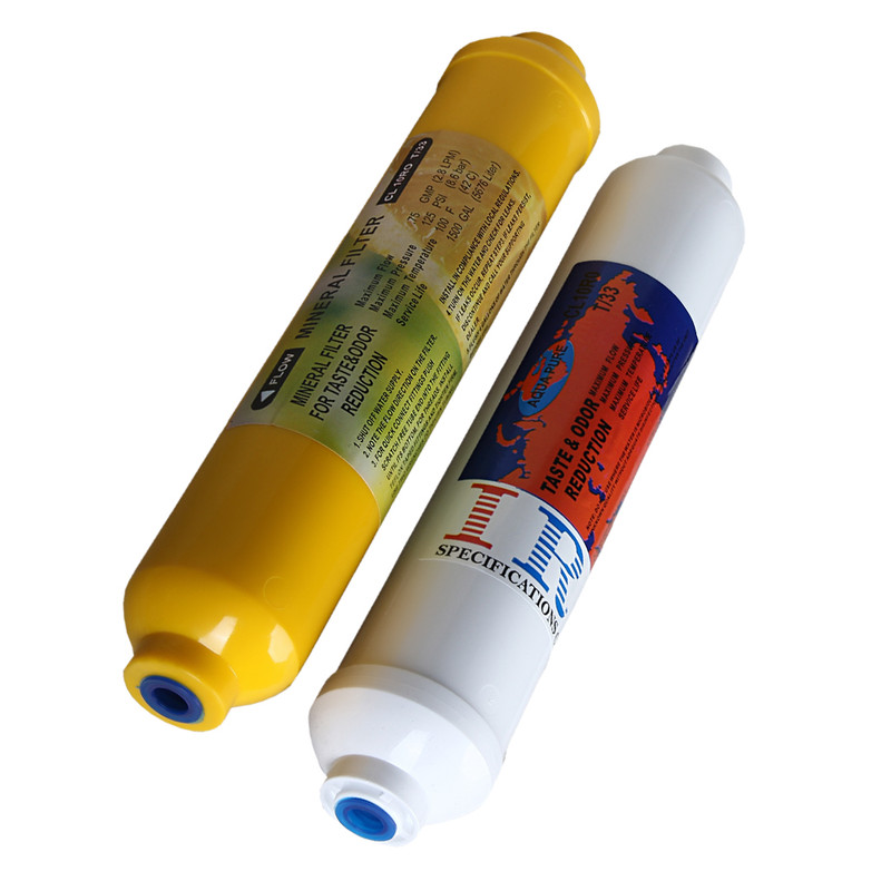 مجموعه ۲ عددی فیلتر دستگاه های تصفیه آب مدل پست کربن و مینرال که از مواد مرغوب جهت هرچه بهتر کردن کیفیت آب میباشد. فیلتر پست کربن در مسیر آب خروجی از ممبران و همچنین مخزن ذخیره قرار میگیرد تا رنگ ،بو و مزه ای که احتمالا به خاطر مخزن ذخیره ایجاد شده است جلوگیری کند. فیلتر مینرال برای جبران املاح مفید گرفته شده توسط فیلتر ممبران میباشد که حاوی کلسیم و منیزیوم و.. جهت بهبود طعم آب بعد از فیلتر ممبران میباشد.