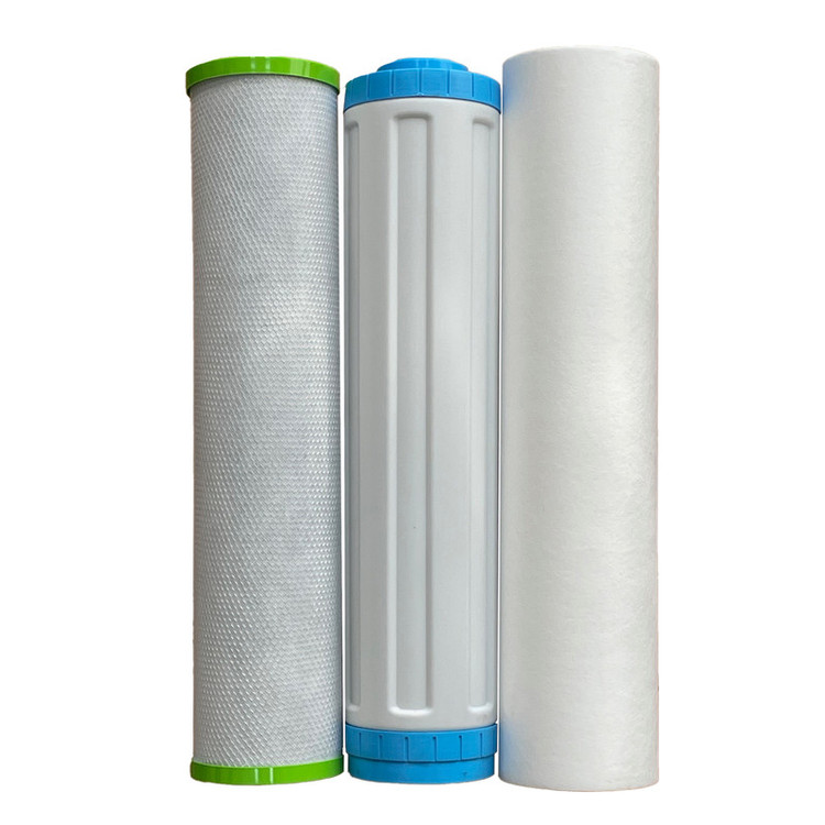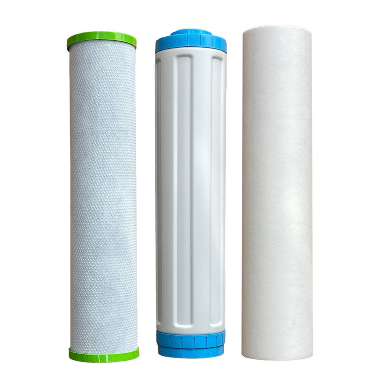 فیلتر پیش تصفیه آب سه عددی الیافی، کربن اکتیو و کربن بلاک 20 اینچ در هوزینگ های جامبو ( 20 اینچ ) به کار میرود که به جهت کاهش گل و لای ، کلر آب ، مزه و طعم ، بوی نامطلوب آب ، میکرو ارگانیزم ها و رنگ آب استفاده می شود ، همچنین کربن اکتیو استفاده شده در آن 100% گیاهی می باشد که نسبت به فیلترهای کربنی رایج دیگر که از کربن زغال سنگ (آنتراسیت) استفاده می کنند سالمتر و با کیفیت تر می باشد ، کربن فعال به کار رفته در این فیلتر از جنس زغال پوست پسته می باشد که طی مراحلی جهت بالا بردن میزان جذب ذرات تا عدد یدین 800 ( میلی گرم در یک گرم کربن ) اکتیو شده است