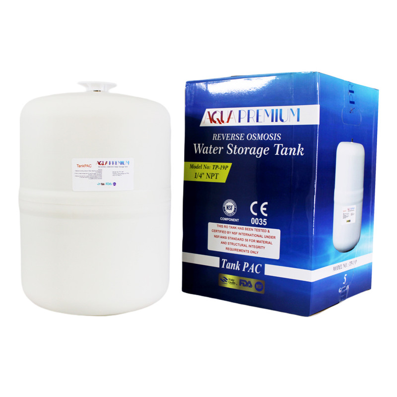 یکی از بهترین و محبوب ترین مخزن تصفیه آب موجود در دنیا ، مخزن تانک پک آکواپرمیوم میباشد. وظیفه اصلی مخزن ، ذخیره آب تصفیه شده و تامین فشار آب خروجی دستگاه میباشد که در نهایت آب ذخیره شده از طریق یک شیر روی سینک به مصرفکننده ارائه میدهد. بدنه منبع از جنس پلی اتیلن و در داخل منبع یک بالن پلاستیکی گذاشته شده است که فاصله بین بالن و بدنه از هوا پر شده است که زمانی که شیر برداشت باز میشود اب در اثر فشار هوایی که به بالن ایجاد میکند از مخزن خارج میشود. این مخزن با گنجایش 19لیتری (5 گالن) میباشد. ابعاد مخزن تانک پک 19 لیتری طول 28 و عرض 28 (قطر 28) و ارتفاع 41 سانتی متر میباشد.