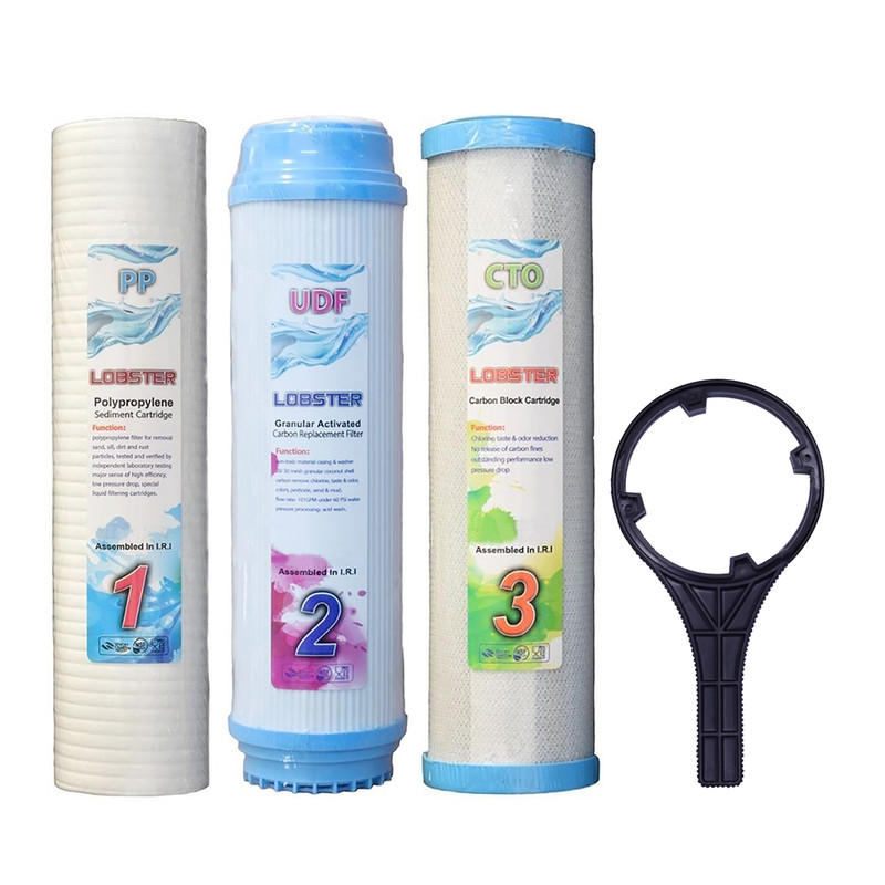 فیلتر دستگاه تصفیه آب خانگی مدل لابستر بسته سه عددی، قابل نصب در تمام دستگاه های تصفیه آب و با استفاده از موادی با کیفیت و با طول عمر بالا ساخته شده و قابلیت حذف رسوبات جامد آب تا قطر 5 میکرون، فلزات سنگین مانند آهن، سرب، جیوه، مواد نیترات دار و کلر را از آب خواهد داشت که ورود هر کدام از آنها به بدن انسان، مشکلات جدیای را برای او به ارمغان خواهد آورد، بطور مثال کلر موجود در آب آشامیدنی باعث ریزش مو و چروک شدن پوست میشود. نحوه حذف کلر در دستگاه تصفیه آب به این صورت است که با آزاد سازی یونهای مثبت و منفی کربن، کلر جذب کربن میگردد و از فیلتر مرحله دوم و سوم عبور نمیکند. در اینجا به توضیح سه فیلتر این بسته خواهیم پرداخت. فیلتر اول از جنس پلی پروپیلن است که منافذ آن 5 میکرون قطر داشته و وظیفهی حذف شن و ماسه، زنگ لوله و مواد درشت داخل آب را دارد که وارد دستگاه و قطعات نشوند؛ توجه داشته باشید که علاوهبر خطرناک بودن ورود املاح گفته شده به بدن انسان، ورود آنها به دستگاه آب تصفیه کن نیز باعث کیپ شدن و گرفتگی شلنگها و رسوب در پمپ دستگاه تصفیه آب میشود و عمر قطعات تصفیه آب را کم میکند، بنابراین در مرحلهی اول (اولین فیلتر) باید مانع از ورود آنها به دستگاه شد. این فیلتر در ابتدا سفید است اما پس از مدتی کارکرد، به رنگ قهوهای و سیاه در میآید. فیلتر کربن اکتیو به عنوان یک صافی برای مواد شیمیایی و سمی به کار میرود.این فیلتر صدرصد گیاهی و از زغال پوست پسته ساخته شده است که طی فرایندی پیچیده به کربن اکتیو با منافذ بسیار ریز تبدیل میشوند. نقش این فیلتر به عنوان صافی مواد شیمیایی و سمی بسیار مهم است و تعویض به موقع آن میتواند به طولانی تر شدن عمر فیلتر اصلی دستگاه کمک کند. این فیلتر متناسب با مصرف باید پس از چهار تا شش ماه کارکرد تعویض شود تا بتواند مواد سمی را بطور کامل از آب حذف کند. فیلتر کربن بلاک که به صورت یک استوانه متخلخل بوده و دور آن با یک طوری پوشانده شده است. این استوانه منافذی با قطر یک میکرون دارد که از منافذ فیلتر اول ریزتر هستند و در نتیجه میتواند مواد ریزتری را از آب حذف کند.
